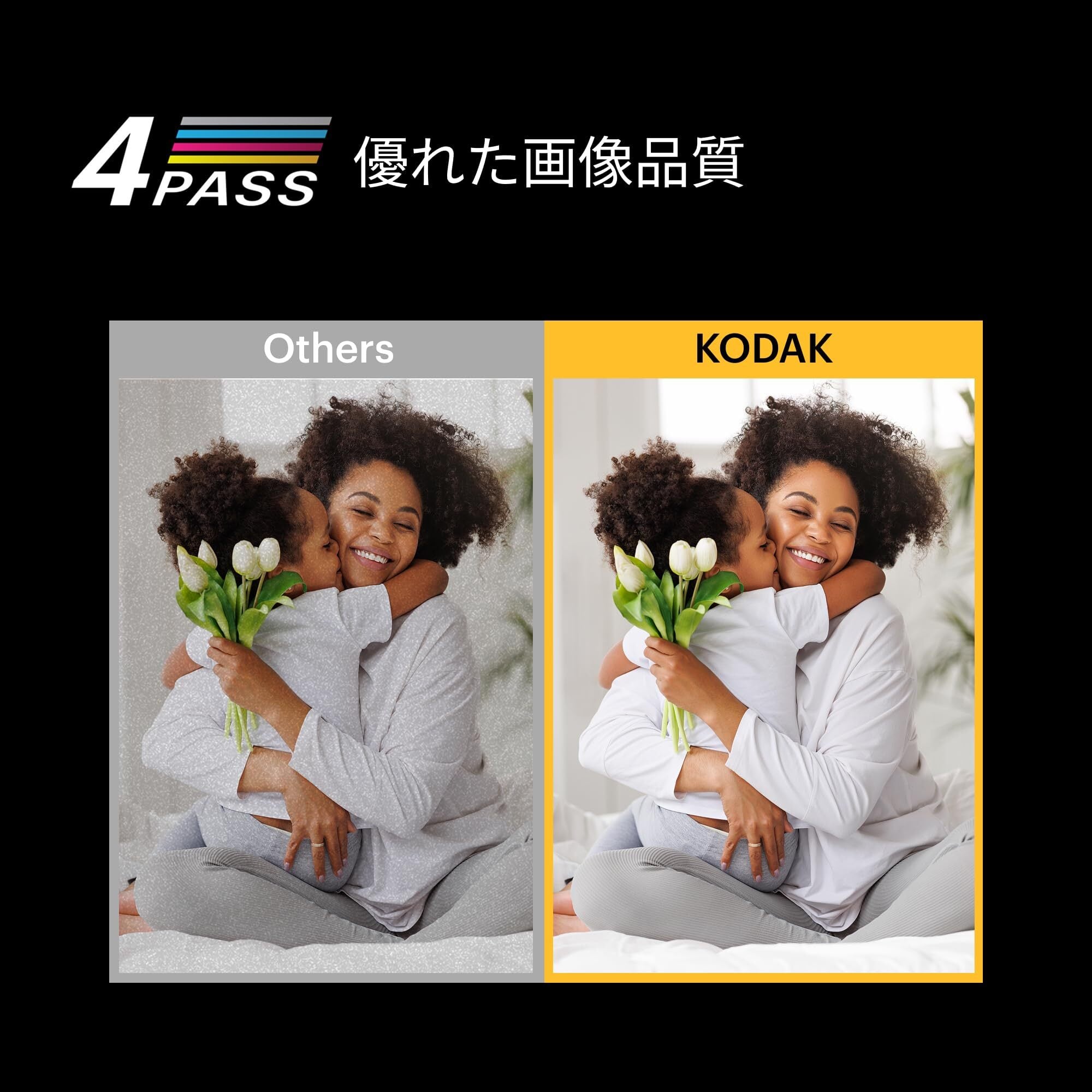 高品質の写真:Kodak Dock Plusは、4PASS技術を使用して完璧な写真を印刷します。みなさんの写真を綺麗に印刷することができます。ラミネート加工でカラーを重ね印刷するので、耐指紋性と耐水性があります。 写真は100年以上続くほどの品質です!写真の品質が高ければ高いほどずっと見たくなる写真になります!
