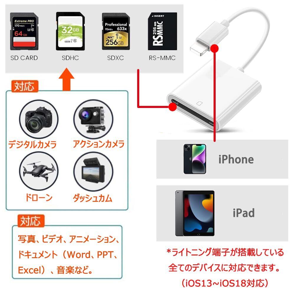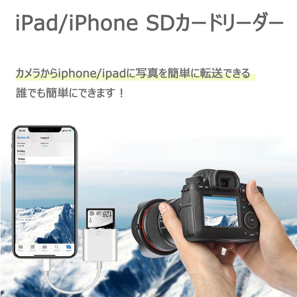 【Lightning SDカードリーダー】ユーザーがより簡単かつ迅速に写真を転送/保存/整理できるようにします。よく使われる用途:カメラ写真の転送、機種変更時のデータ転送、ファイルの保管。