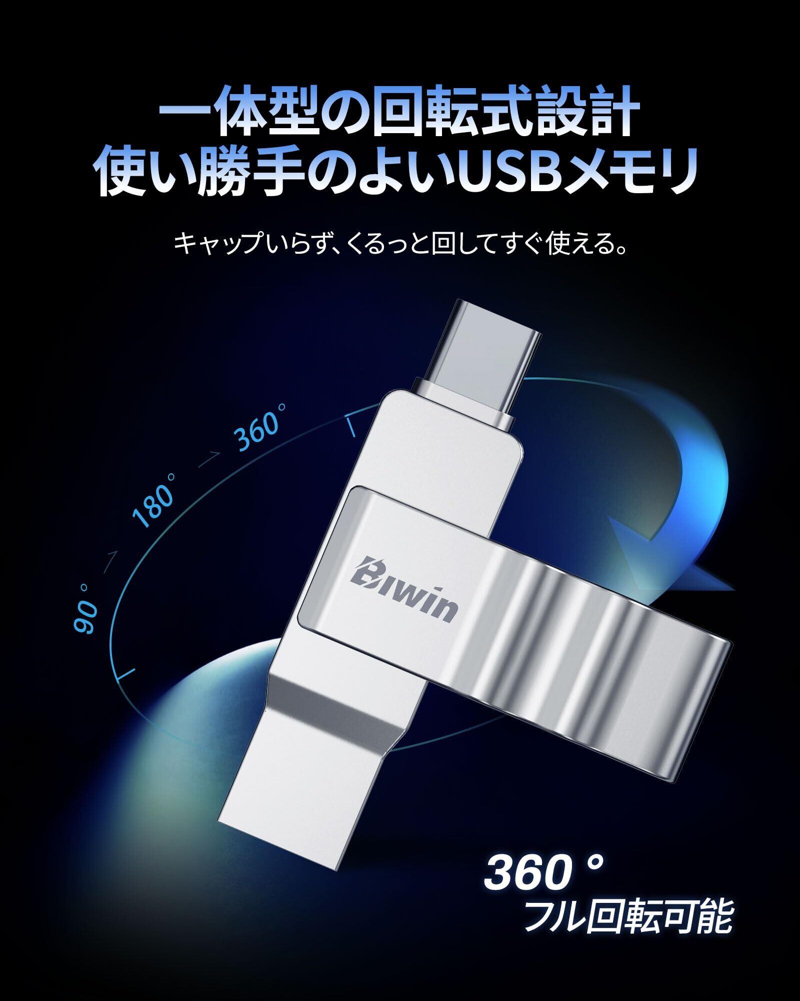 Biwin UD150 USB メモリ Type-C/A 2in1 回転式 64GB USB 3.2 高速 最大読出速度150MB/s 金属製 軽量&耐久性 USB-C/Aデュアルコネクタ