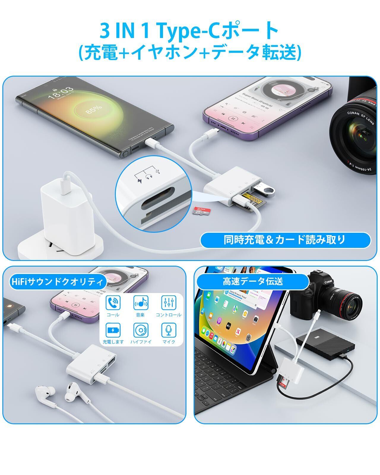 【多機能Type-Cポート】iPad sdカードリーダーのUSB C入力ポートには3つの機能(急速充電、データ転送、オーディオ転送)があり、様々なニーズに対応します。 例えば、充電しながらのデータ転送、音楽を聴きながらのデータ転送など。