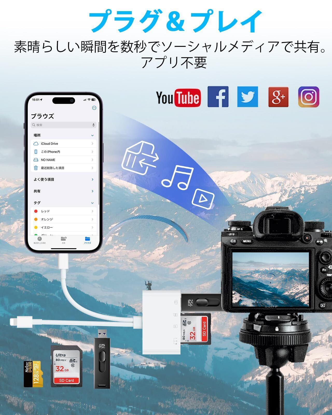 【簡単な操作・ポータブル】WiFi、Bluetooth、アプリのダウンロードは不要で、携帯電話やコンピュータの[ファイル管理]プログラムからデータを転送できます。 赤ちゃんの手のひらサイズのlightning sdカードリーダーは、バックパックに簡単に収まることができ、外出や屋外での持ち運びに最適です。