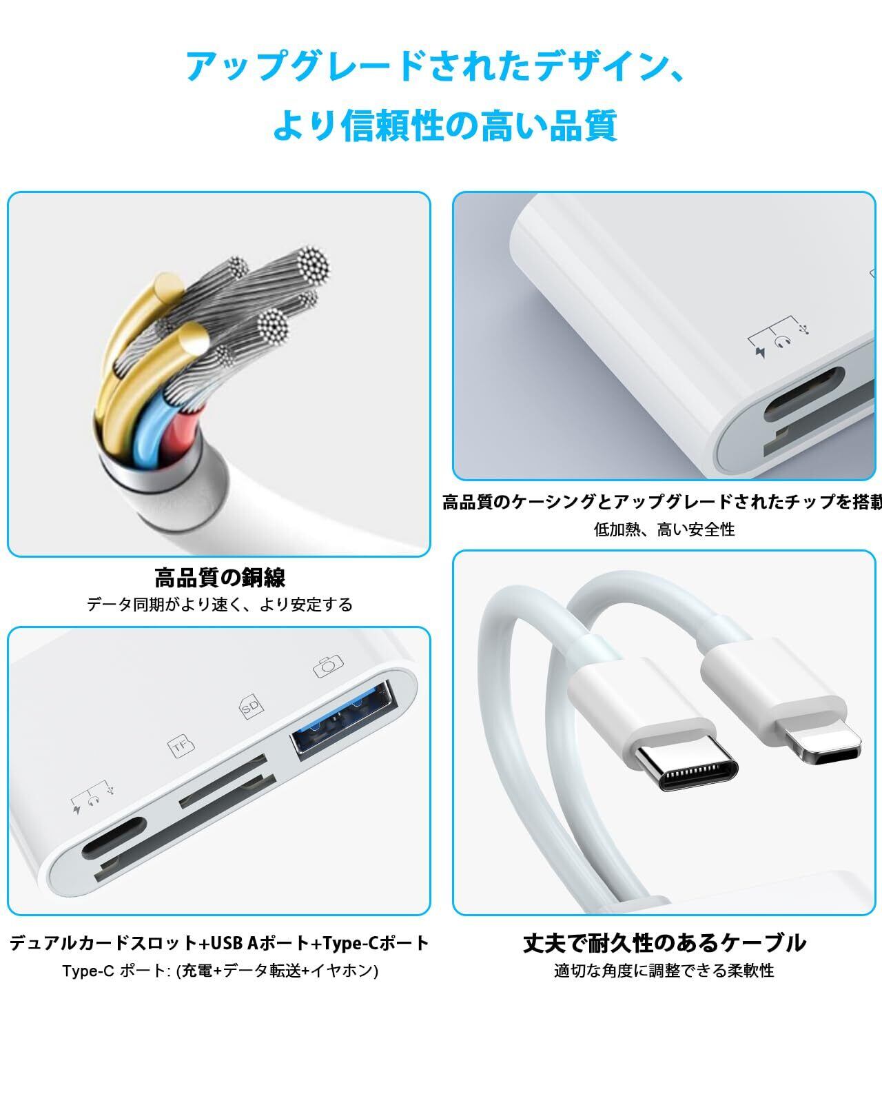 4in1 iPhone SDカードリーダー 【2025新モデル MFi認証品】Lightning/USB C カードカメラリーダー USB/SD/TF変換アダプタ・SDカード・microSDカード・急速充電 | ハイレゾ音質 | データ移行保存 | 高速読み取り・転送・コピー(双方向)| 設定不要 操作不要 iPhone/iPad/PC/Androidスマホなどのデバイスに対応
