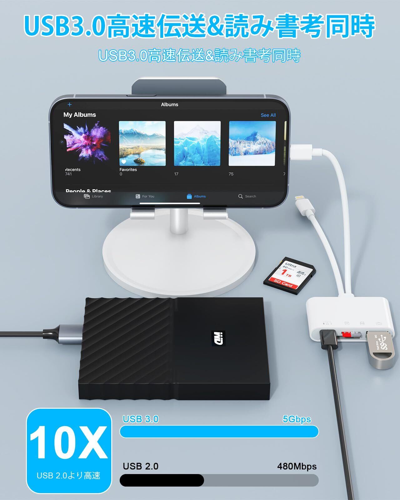 【高速読み取り・転送・コピー(双方向)、OTG機能】ライトニング カードリーダーは、SDカード/MicroSDカードとスマートフォン/タブレット/PC間の双方向データ転送をサポートしています。 最大転送速度は720MB/sで、60枚の写真を10秒で転送できます。 注:SDカードとmicroSDカードは同時に使用できません。