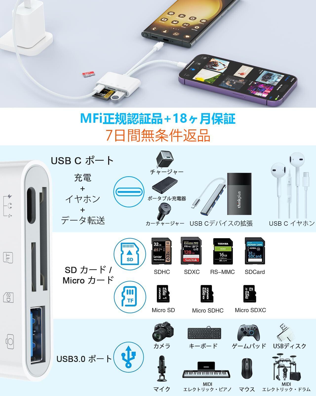 【4in1 iPhone カードリーダー】SD カードリーダーは最新の2024 MFI認証チップを搭載し、異なる機能を持つ4つのポート(SDカードポート、microSDカードポート、USB 3.0ポート、USBCフルファンクションポート)を備えています。 一般的な用途:カメラの写真転送、機種変更時のデータ転送、ファイルの保存、音楽鑑賞、USBやその他の周辺機器の使用。