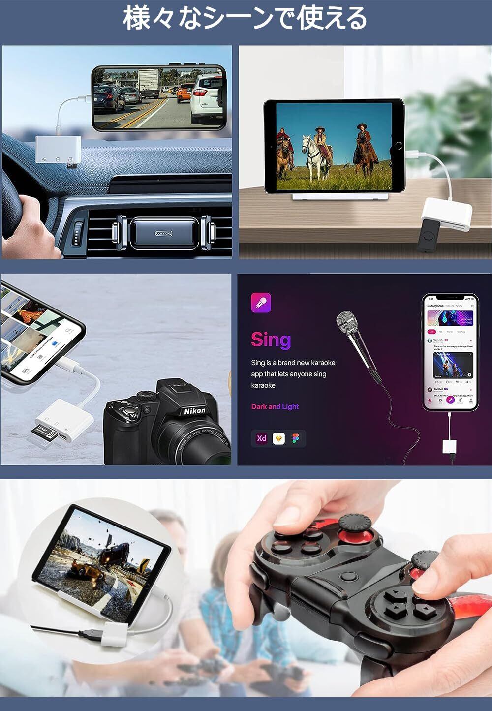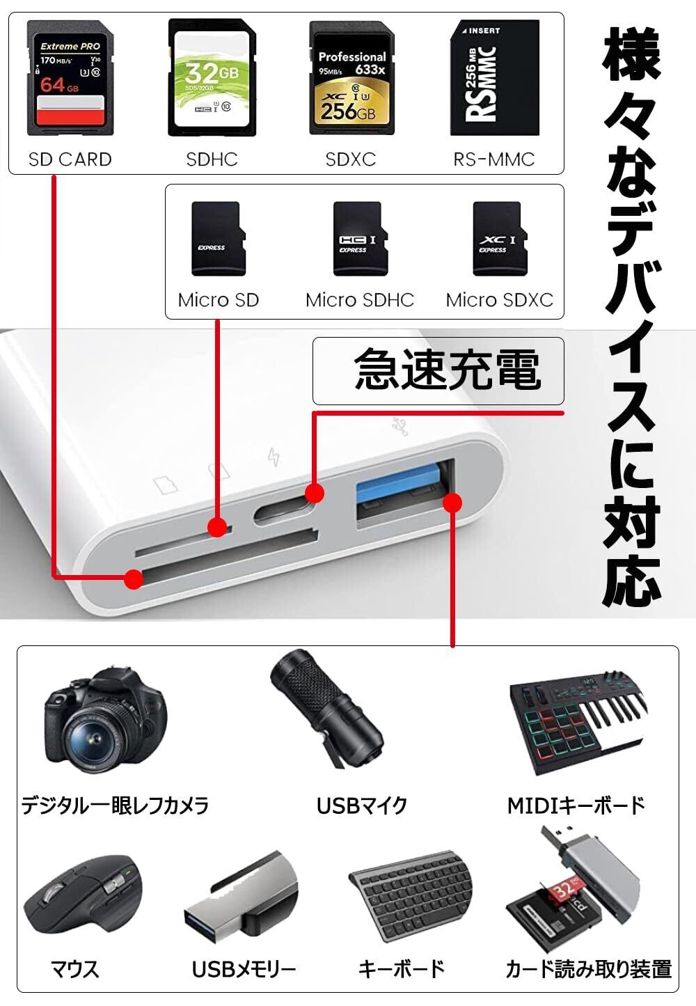 【高い互換性】SDカード、Micro SDカード、カメラに加えて、USBフラッシュメモリ・キーボード・マウス・マイク・ゲームコントローラーなどのUSB周辺機器も接続できます。カードスロットとUSBインターフェースは同時に使用可能。このアダプターはiPhone / iPadデバイスと互換性があります。ライトニング端子が搭載している全てのデバイスに対応できます。(iOS9~iOS18対応)