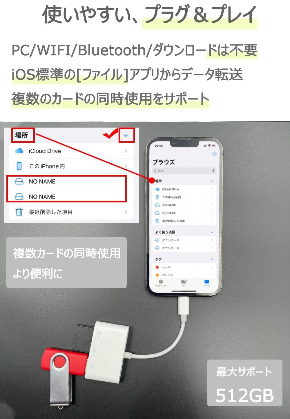【プラグ&プレイ、複数カードの同時使用】PC/WIFI/Bluetooth/ダウンロードは不要。iOS標準の[ファイル]アプリからデータ転送。複数のカードの同時使用をサポート。