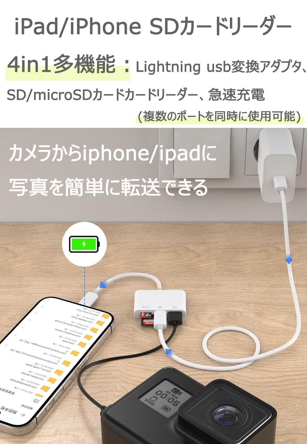 4in1 iPhone SDカードリーダー【2025MFi認証品、24ヶ月】Lightning usb変換アダプタ・SDカード・microSDカード・急速充電 | デジタルカメラ カードリーダー | データ移行保存 | 高速読み取り・転送・コピー(双方向)| 設定不要 操作不要 | 日本語取説付き(iOS9~iOS18対応)