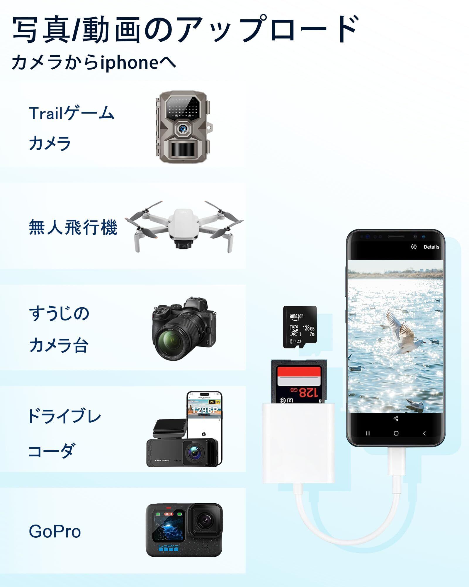 優れた互換性: このiPhone SDカードリーダーは、iPhone 14/14 pro/14 Pro Max/13/13 Mini/13 Pro/13 Pro Max/12/12 Mini/12 Pro/12 Pro Max/11/11 Pro/11 Pro Max/Xs/Xs Max/se と互換性のある1つのSDカードポート(SD/SDHC/SDXC/RS-MMC/MMC-Microカード)と1つのTFカードポート(マイクロSD/マイクロSDHC/マイクロSDXCカード)を備えています。Mini/13 Pro/13 Pro Max/12 Mini/12/12 Pro/12 Pro Max/11/XR/XS/X/8/7/6/5、Canon、Nikon、iPadおよびその他のデバイス。8GB/16GB/32GB/64GB/128GB/256GB/512GB の SD/SDHC/SDXC カードに対応しており、Micro SD アダプタ付きの Micro SD カードもサポートしています。最大512GBのメモリーカードに対応。