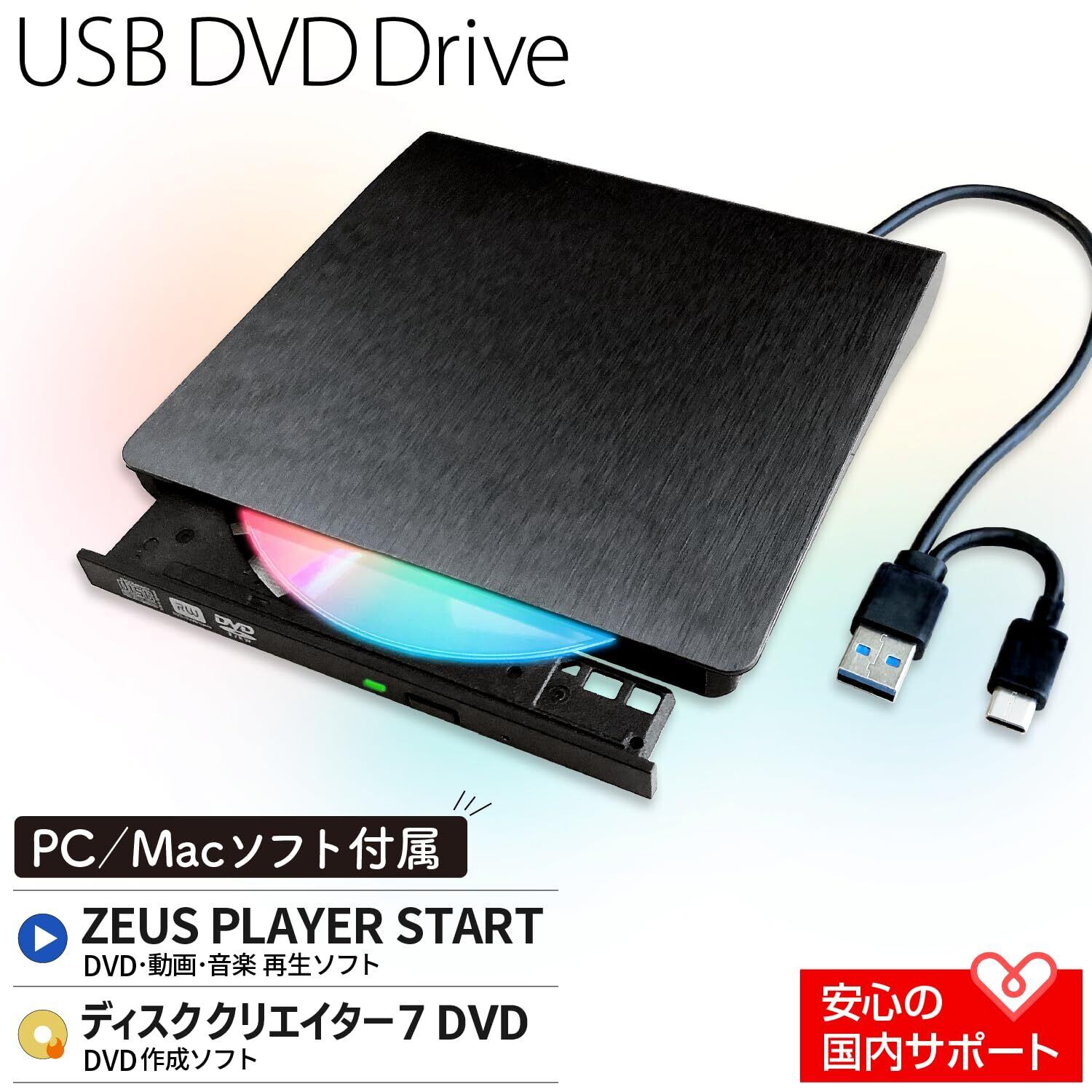 【トップ・セラー DVDドライブ + DVD再生ソフト・DVD作成ソフト 付属】USB 3.2 外付けDVDドライブ USB A & C ケーブル内蔵(USB2.0~4.0,Thunderbolt 互 換)、Win Mac Linux 他対応、DVD/CD読込・書込 高精度(DVD 8倍速・CD 24倍速) 、バスパワー 即接続、安心の国内メーカー・国内サポート