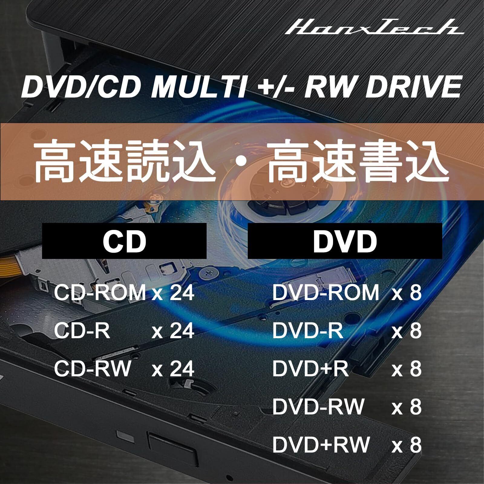 【2024年モデル 日本メーカー】 高速USB通信半導体を搭載しCD24倍速、DVD8倍速の読込・書込をスムーズに実施できるようになりました。様々な家電、AV機器を開発・販売するHanx株式会社(横浜市)の最新モデルです。