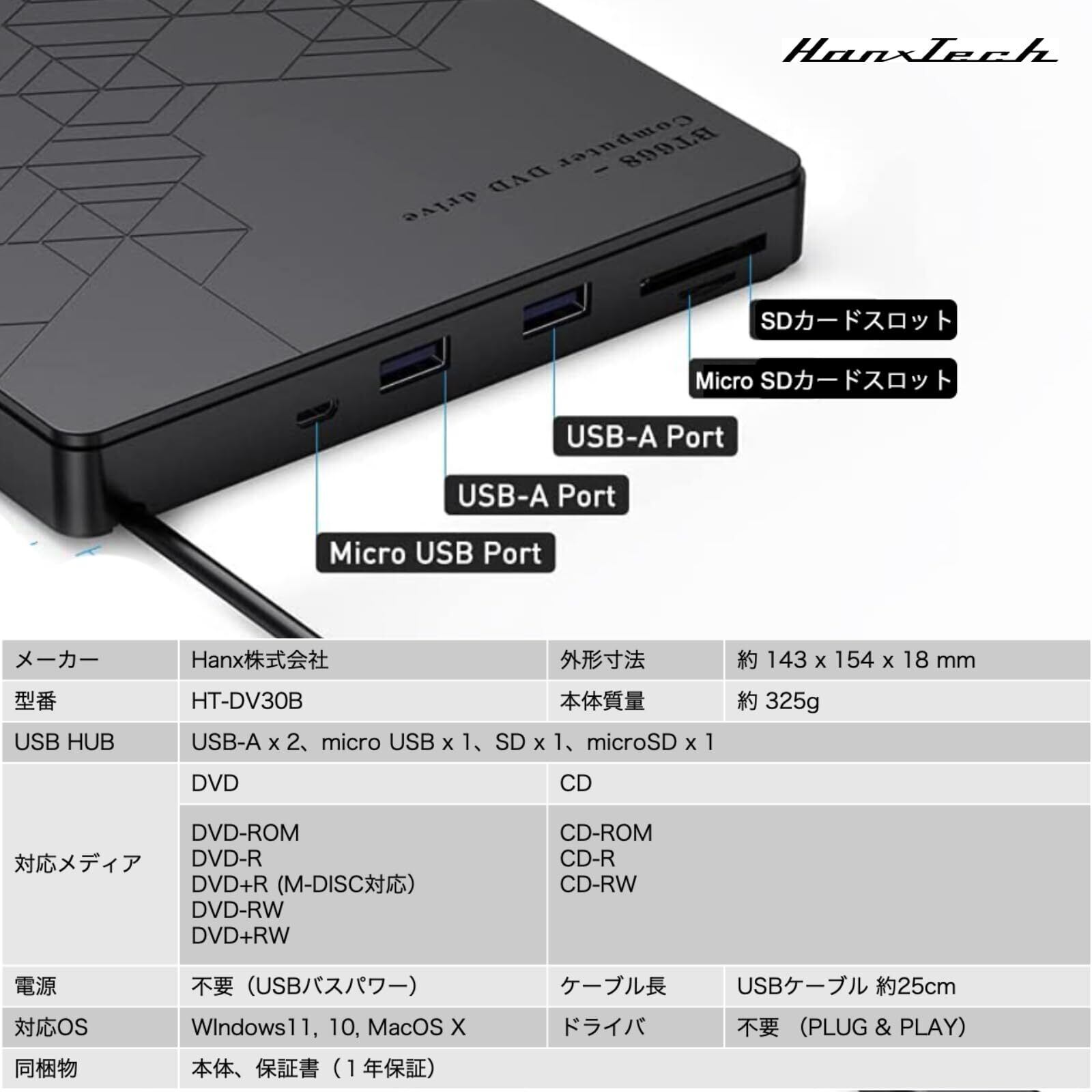 【限定】Hanx株式会社 日本メーカー USB-HUB付 DVDドライブ外付け USB 3.0接続 Type-C CD/DVD +/-RW アダプター CD/DVDディスク読取/書込対応 光学ドライブ 薄型ポータブル Windows/Mac HT-DV30B