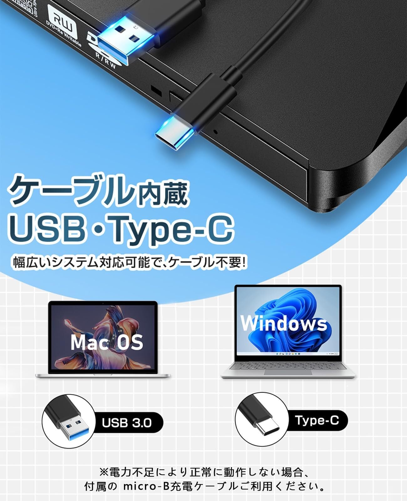 【Windwos&Mac両対応・接続だけ使用開始】MacユーザーでもWindowsユーザーでも、この dvdプレーヤー は完璧に対応しています。Windows 11、Windows 10、Windows 8、Windows 7、Windows XP、Linuxなど、多様なOSに対応。USBとType-Cのダブルインターフェースで、さまざまなデバイスへの接続が簡単で、「即挿即使」の利便性を実現します。