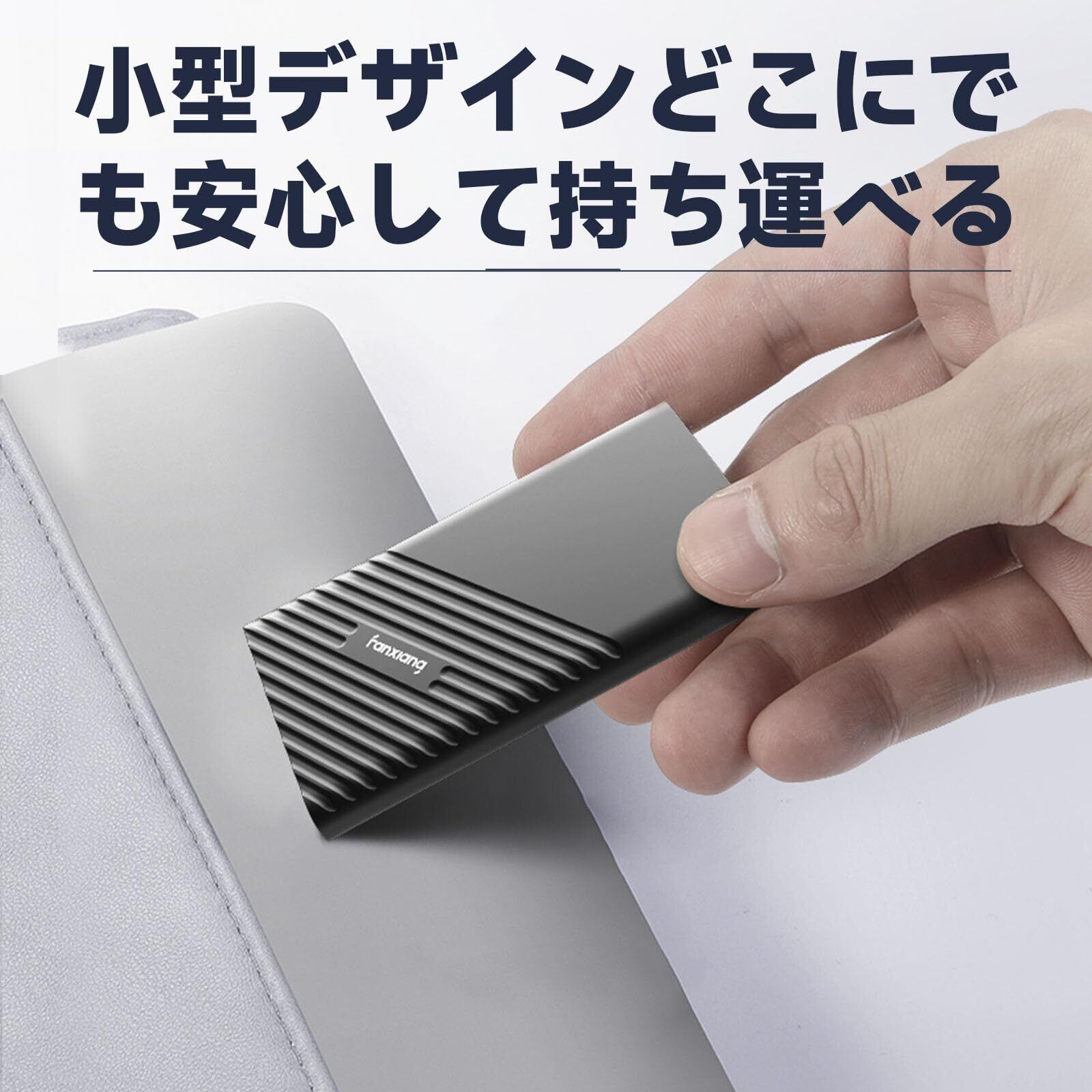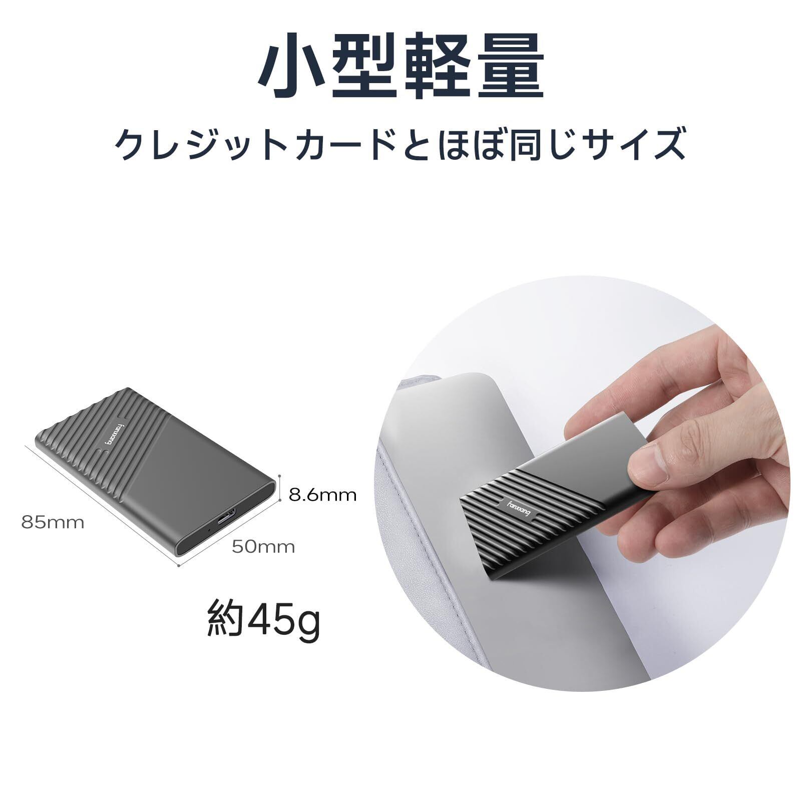 【2,050MB/s読み、1,800MB/s書き込みなのに小型軽量】この外付けSSDはTLC 3D NAND採用し、USB 3.2 Gen2x2dで最大 2,050MB/秒のシーケンシャル読み取りおよび最大 1,800MB/秒のシーケンシャル書き込みの速度を実現しており、最大4TBのストレージを提供しているので、データのバックアップだけでなく、4K動画などの高解像度の映像やメディアファイルの保存に最適です。 ※転送速度はホストのハードウェア、ソフトウェア、使用方法、ストレージ容量等によって異なる場合があります。 超コンパクトのサイズ:8.5cm(L)x5cm(W)x0.8cm(H) 約45g。