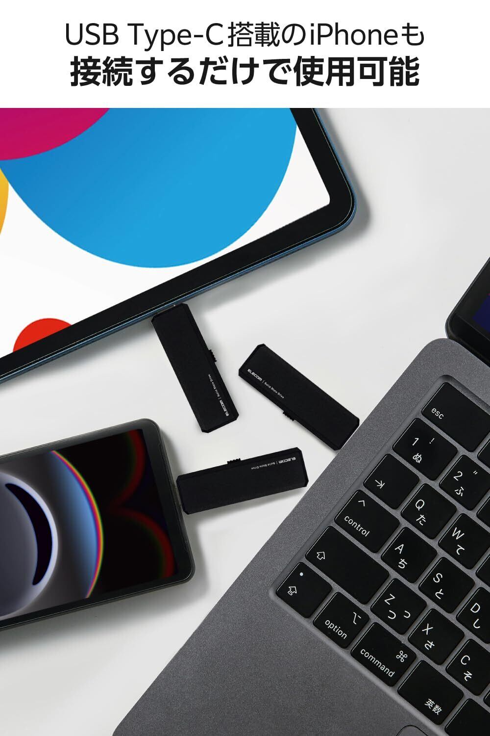 従来のUSB-Aポート搭載パソコンはもちろん、USB Type-Cポートを搭載したMacやiPhone、iPadなどでも、ケーブルやアダプターを別途購入することなく、接続するだけですぐに使用可能です。