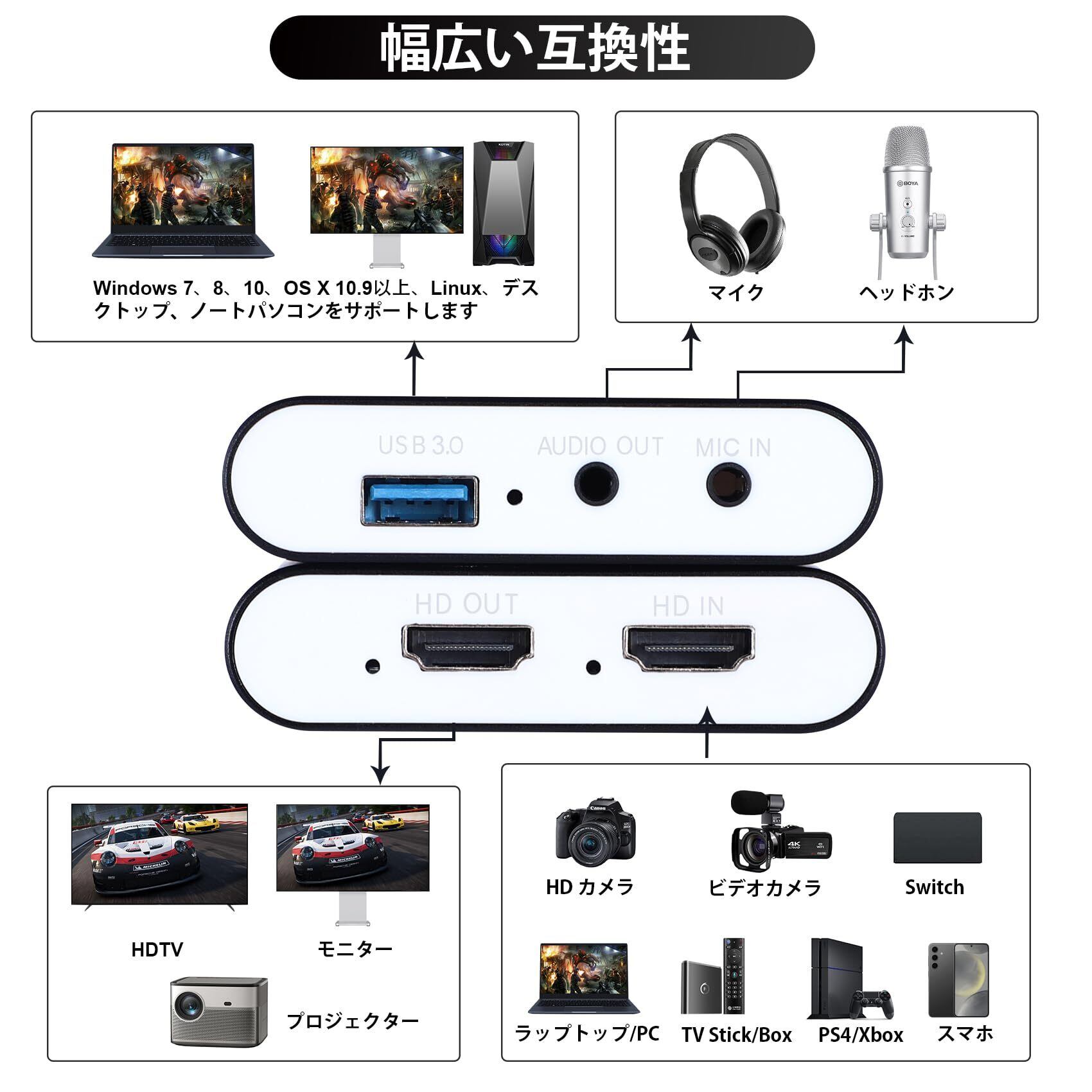 HDMI キャプチャーボード Switch対応 4K パススルー対応 1080P 60FPS USB 3.0 高速伝送 ビデオゲームキャプチャー ボード PC/PS4/PS5/Xbox/Wii U/ウェブカメラ/スマートフォン対応 Windows 7/8/10/11 Mac Linux Android iPad に対応、OBS Zoom XSplit QuickTime Potplayer 互換