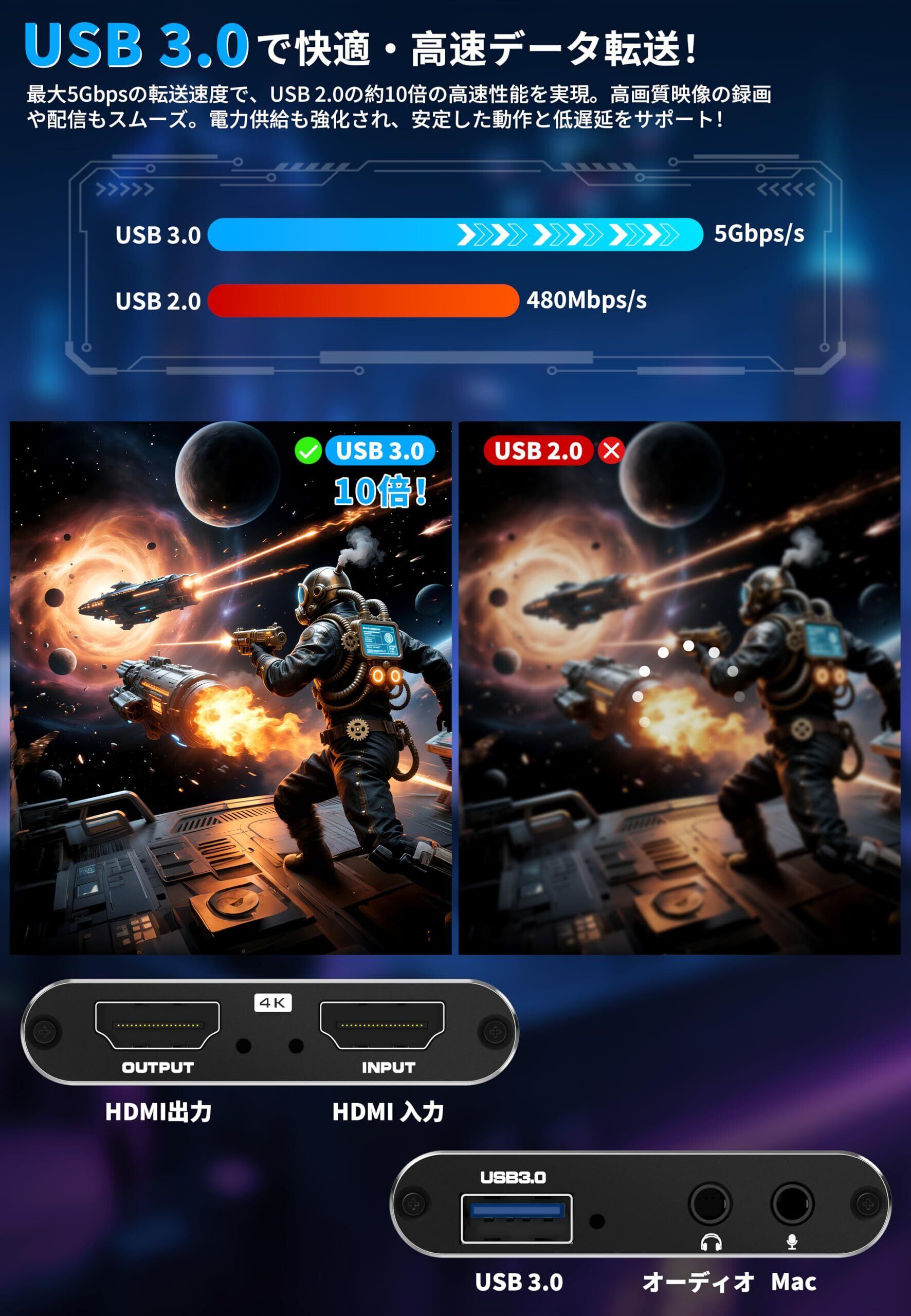 【USB3.0接続による高速転送・遅延なし】 USB3.0インターフェースを採用し、データ伝送が高速且つ遅延ゼロ。ライブ配信やリアルタイム編集に非常に適しています。長時間使用してもラグくないです。