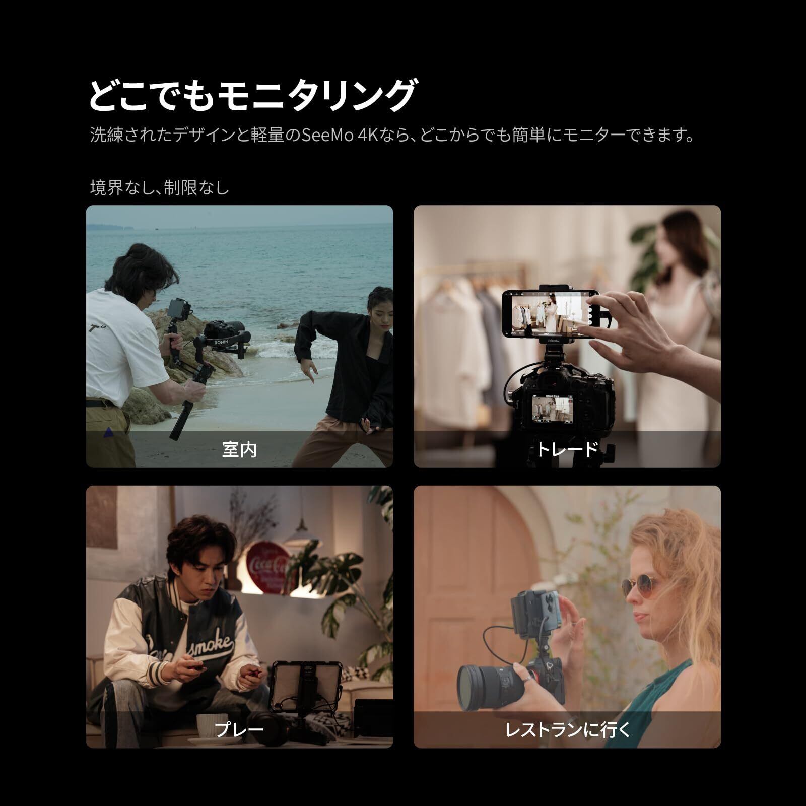 対応機種:SeeMo 4K カメラモニターは、i-Phone 17・17 Pro・17 Pro Max・16・16 Plus・16 Pro・16 Pro Max・15・15 Plus・15 Pro・15 Pro Max・14・14 Plus・14 Pro・14 Pro Max・13・13 mini・13 Pro・13 Pro Max・12・12 mini・12 Pro・12 Pro Max・11・11 Pro・11 Pro Max・XR・XS・XS Max・X・8・8 Plus に対応しています。また、2025 年モデル新 iPad およびその他選択された iPad モデル(2025 年モデル 11 インチ iPad(A16)・2025 年モデル iPad Air(M3)・iPad mini 2/3/4/5/6/7・iPad Air/Air 2/Air 3/Air 4・12.9 インチ iPad Pro Gen 2(第 2 世代)・12.9 インチ iPad Pro Gen 1(第 1 世代)・10.5 インチ iPad Pro・iPad 5/6/7/8)にも対応しています