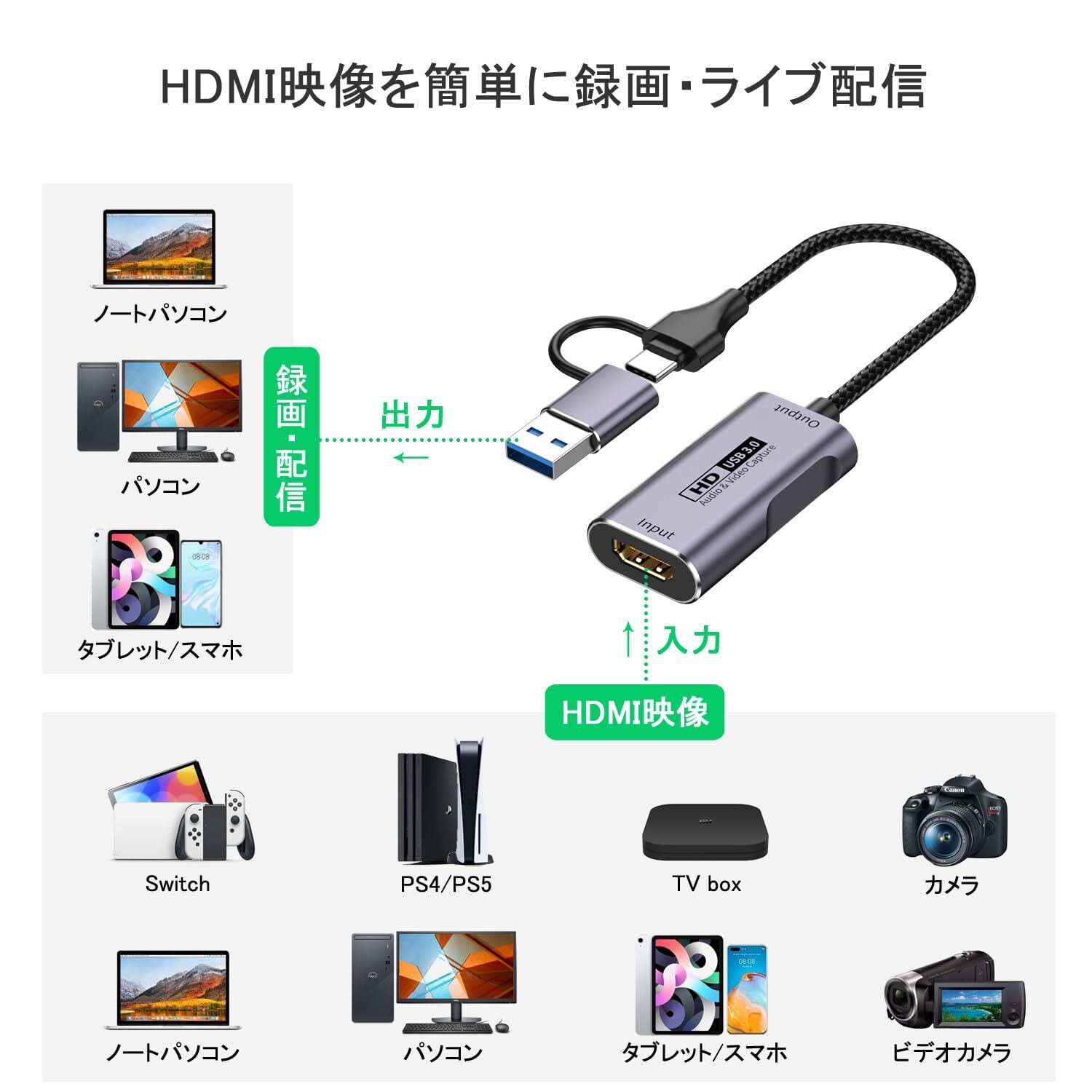 DigiZaru HDMI ビデオキャプチャ USB3.0 4K入力 1080P@60Hz YUY2出力 USB Type A&Type C 2in1 PCゲーム/Switch/PS5,4/Xbox/カメラ/TVの映像を録画・ライブ配信用 キャプチャーボード Windows/Mac OS/Android対応