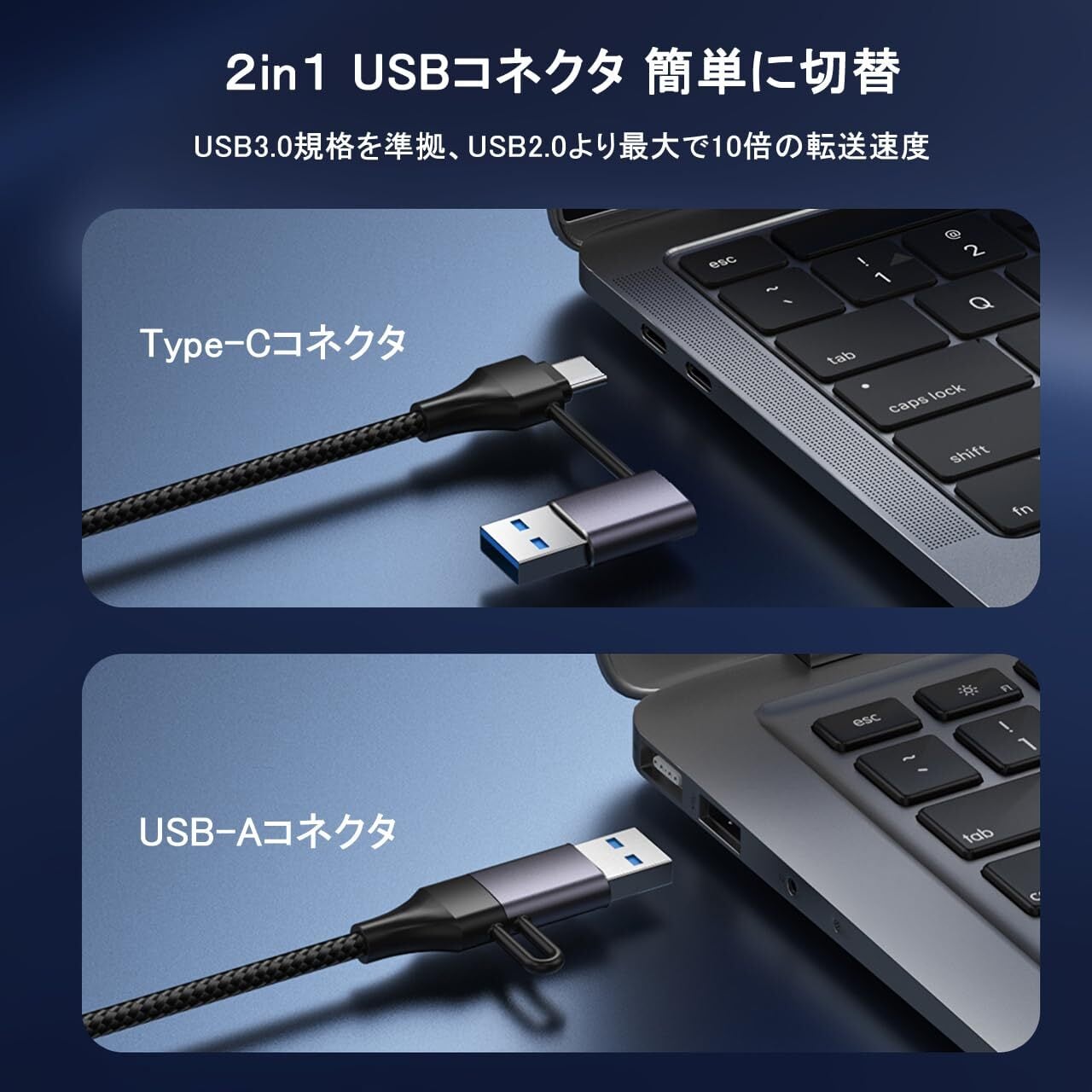 ❷【USB3.0 2in1 コネクタ】USB3.0規格を準拠、USB2.0より最大で10倍の転送速度、高画質ビデオを出力できる下地になっています。USB Type AとType C 2in1のコネクタでどのパソコンでも接続できる、変換アダプターを探す手間を省けます。