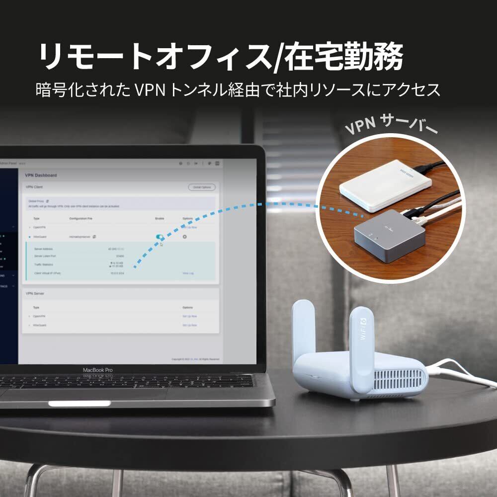 【VPNクライアントとサーバ】GL-MT3000 (Beryl AX) vpn ルーター はOpenVPNとWireGuardはプリインストールされており、30以上のVPNサービスプロバイダと互換性があります。既存のVPNアカウントにログインするだけで、Beryl AX は接続されたネットワーク内のすべてのネットワークトラフィックを自動的に暗号化します。最大VPN速度は150 Mbps(OpenVPN)、300 Mbps(WireGuard)