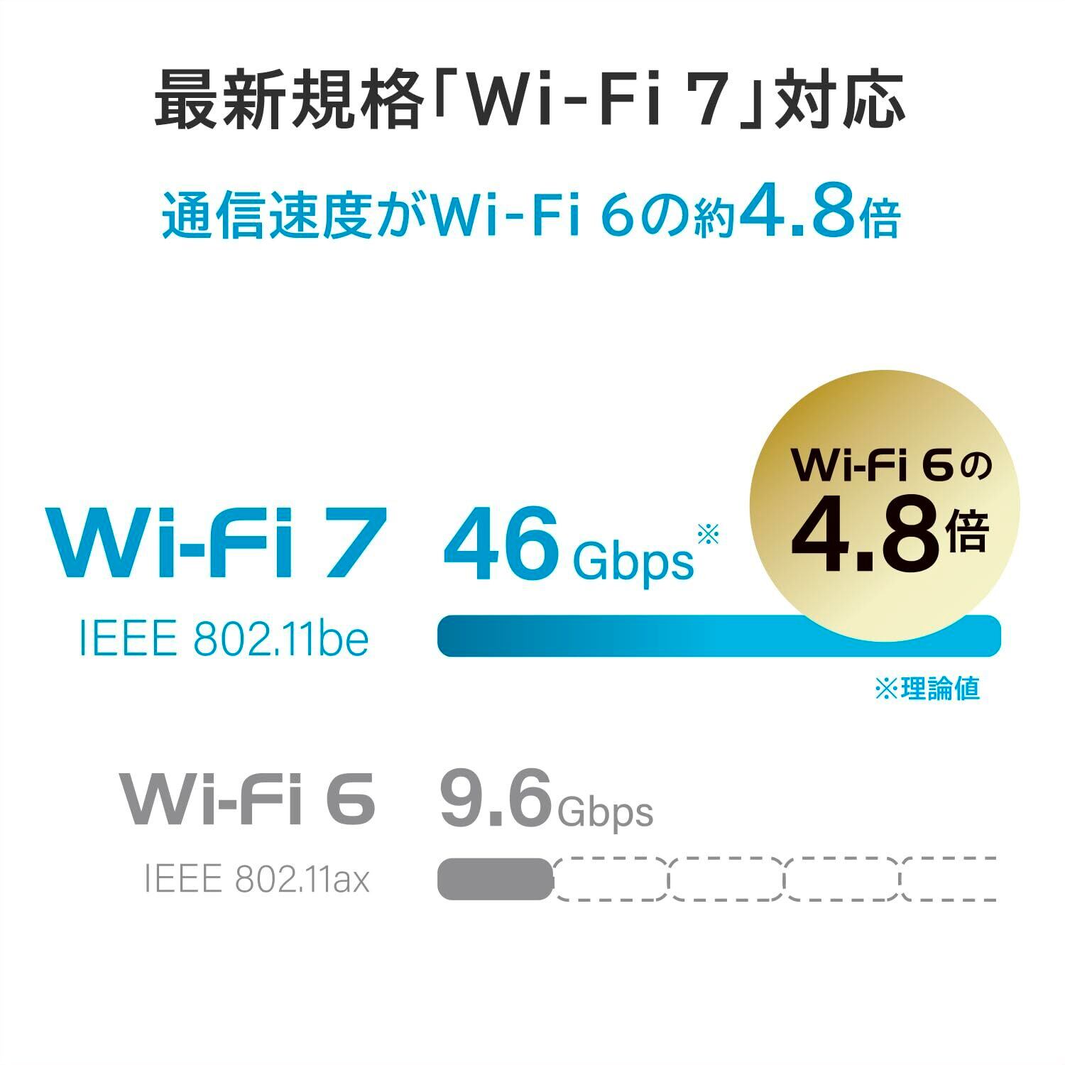 【最新規格「Wi-Fi 7」対応】「Wi-Fi 7」とは、Wi-Fi 6/6Eをベースとし、通信速度と安定性が向上した新しいWi-Fi規格です。最大通信速度が46Gbpsまで増加しました。また、2.4GHz/5GHz/6GHzの複数周波数帯を同時に利用できるMLO機能により、従来規格から通信速度と安定性が飛躍的に進化。最大通信速度で比較すると、Wi-Fi 6の4.8倍、Wi-Fi 5の13倍を実現(※理論値)しました。
