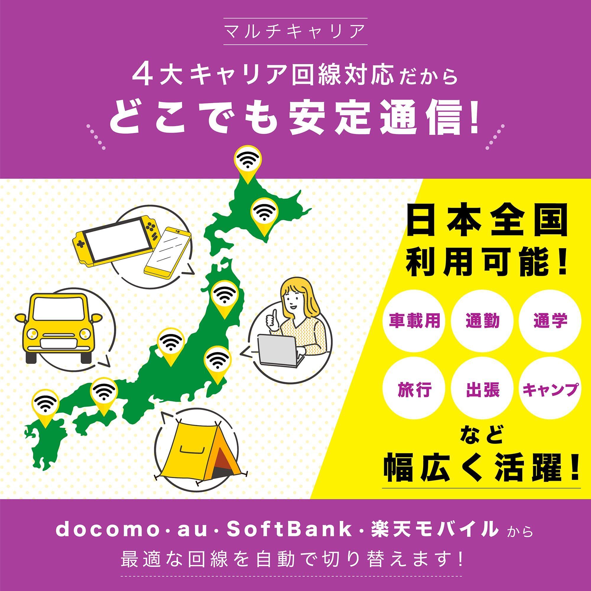 【国内主要3キャリア対応で安定接続】 国内主要キャリア(au、docomo、Softbank)の回線に対応したマルチキャリア仕様。エリアや環境に応じて最適な回線に自動接続されるため、移動中でも安定した通信が可能です。追加ギガは公式サイトから簡単に購入でき、使い勝手も抜群です。