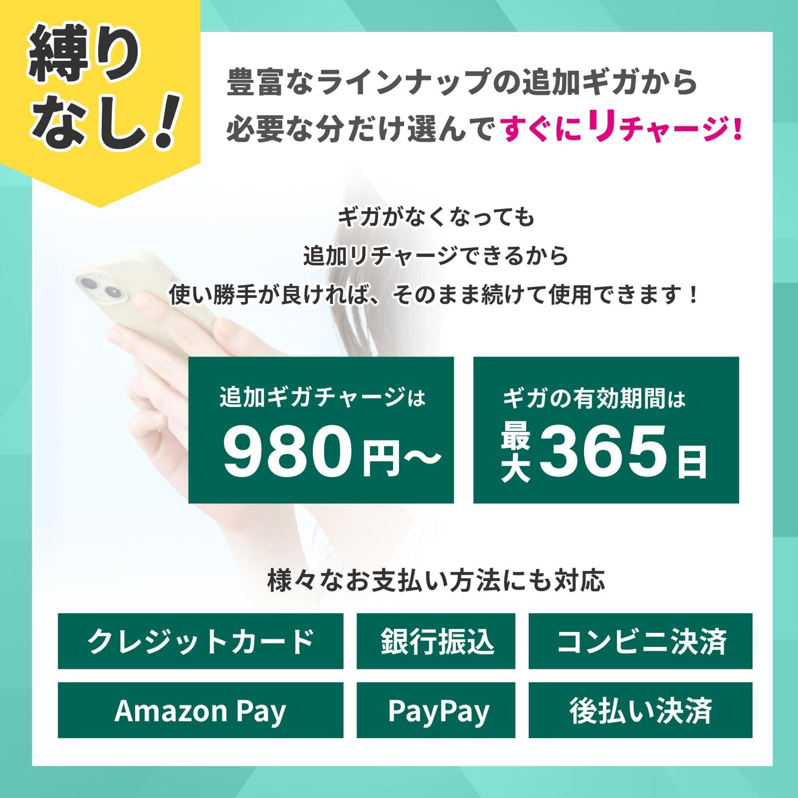 【追加ギガのリチャージ】ギガ容量・有効期間ともに豊富なプランをラインナップ。リチャージは公式サイト&アプリのマイページで24時間365日、簡単&お得にいつでも購入可能。お支払い方法はクレジットカードの他、 Payやコンビニ決済、銀行振込など多彩な支払い方法に対応。決済完了後すぐにリチャージ反映