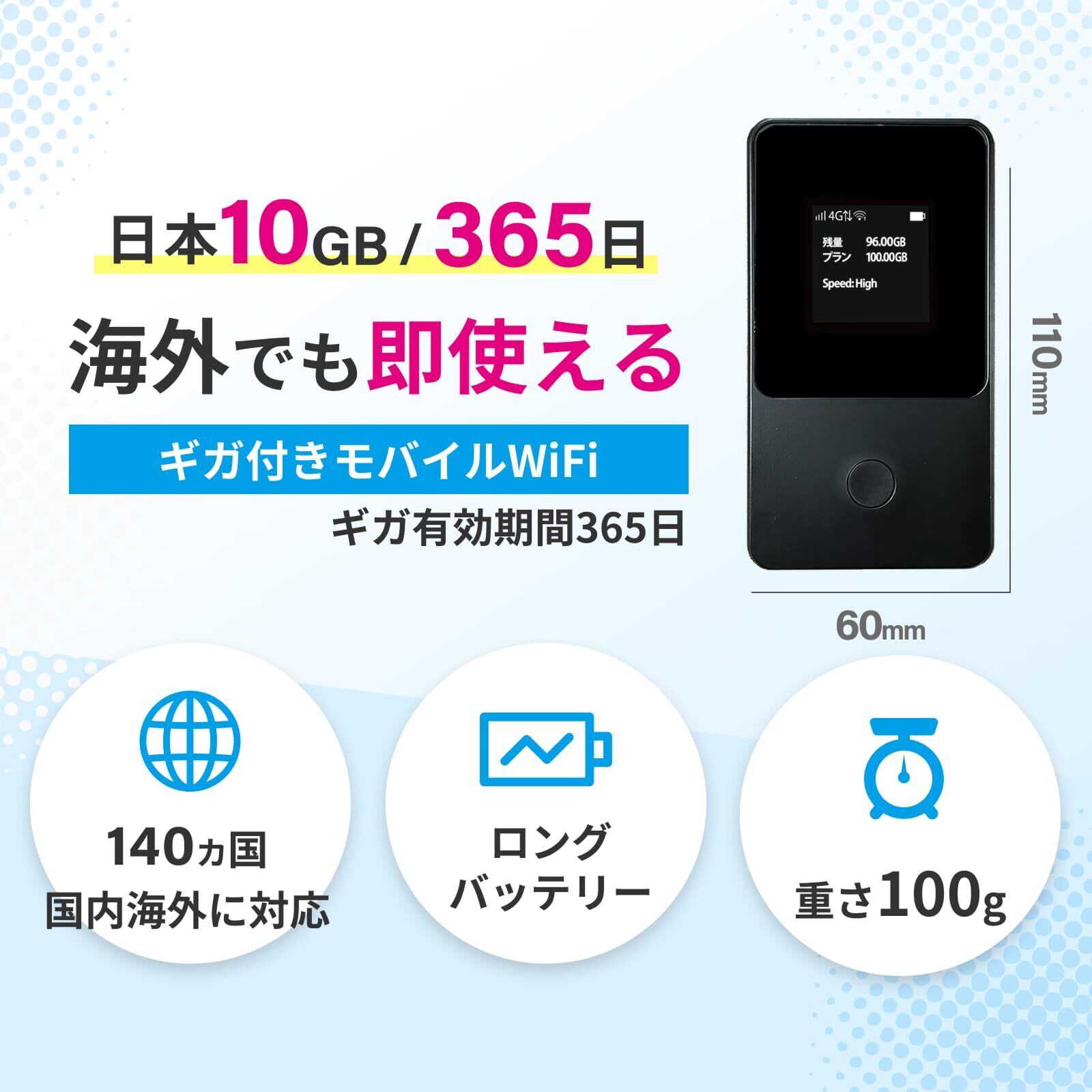 15時間のロングバッテリー、国内&海外の初回ギガ付き、ルーター本体は電源を入れるだけの簡単セットアップ、軽量100g、簡単ボタン操作