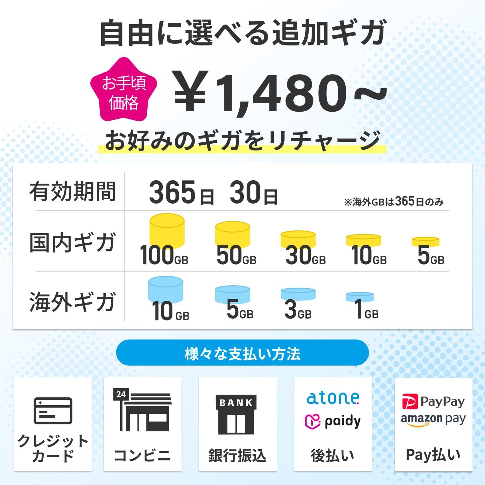 【追加ギガのリチャージ】ギガ容量・有効期間ともに豊富なプランをラインナップ。リチャージは公式サイト&アプリのマイページで24時間365日、簡単&お得にいつでも購入可能。お支払い方法はクレジットカードの他、 Payやコンビニ決済、銀行振込など多彩な支払い方法に対応。決済完了後すぐにリチャージ反映