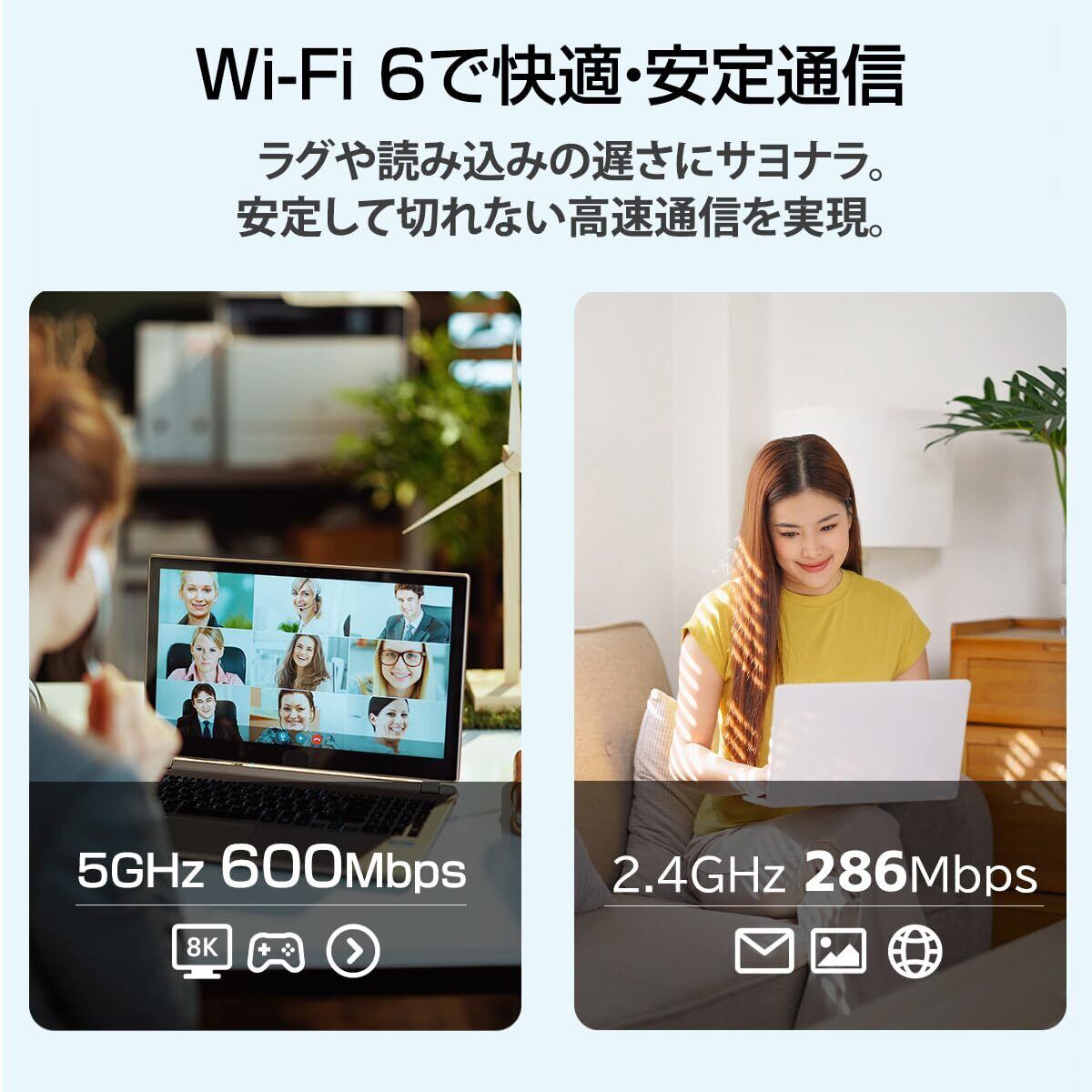 【WiFi6対応で超高速通信】次世代規格WiFi6(AX)対応。5GHz帯域で最大600Mbps、2.4GHz帯域で最大286Mbpsの高速データ転送を実現。大容量データもストレスなく快適通信。