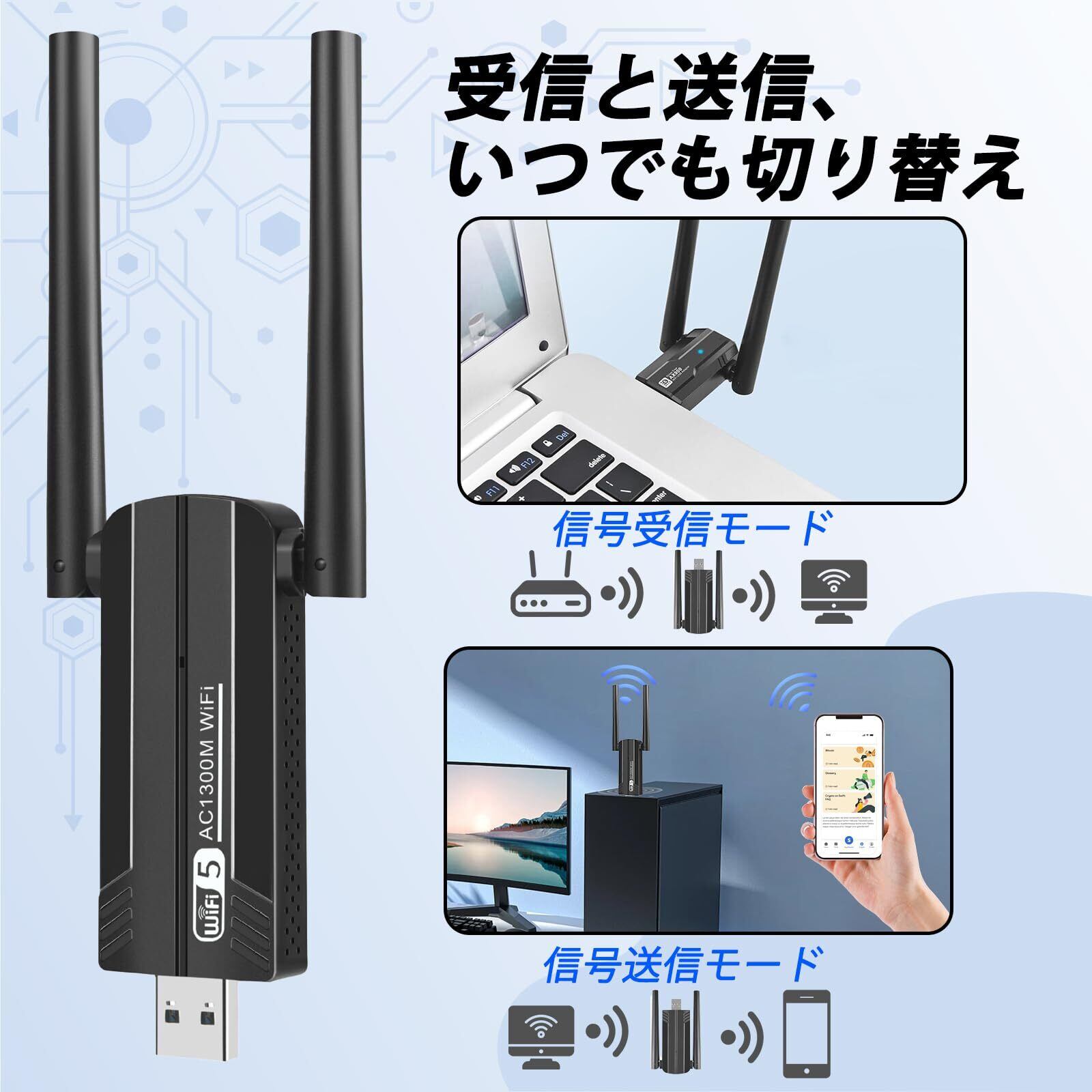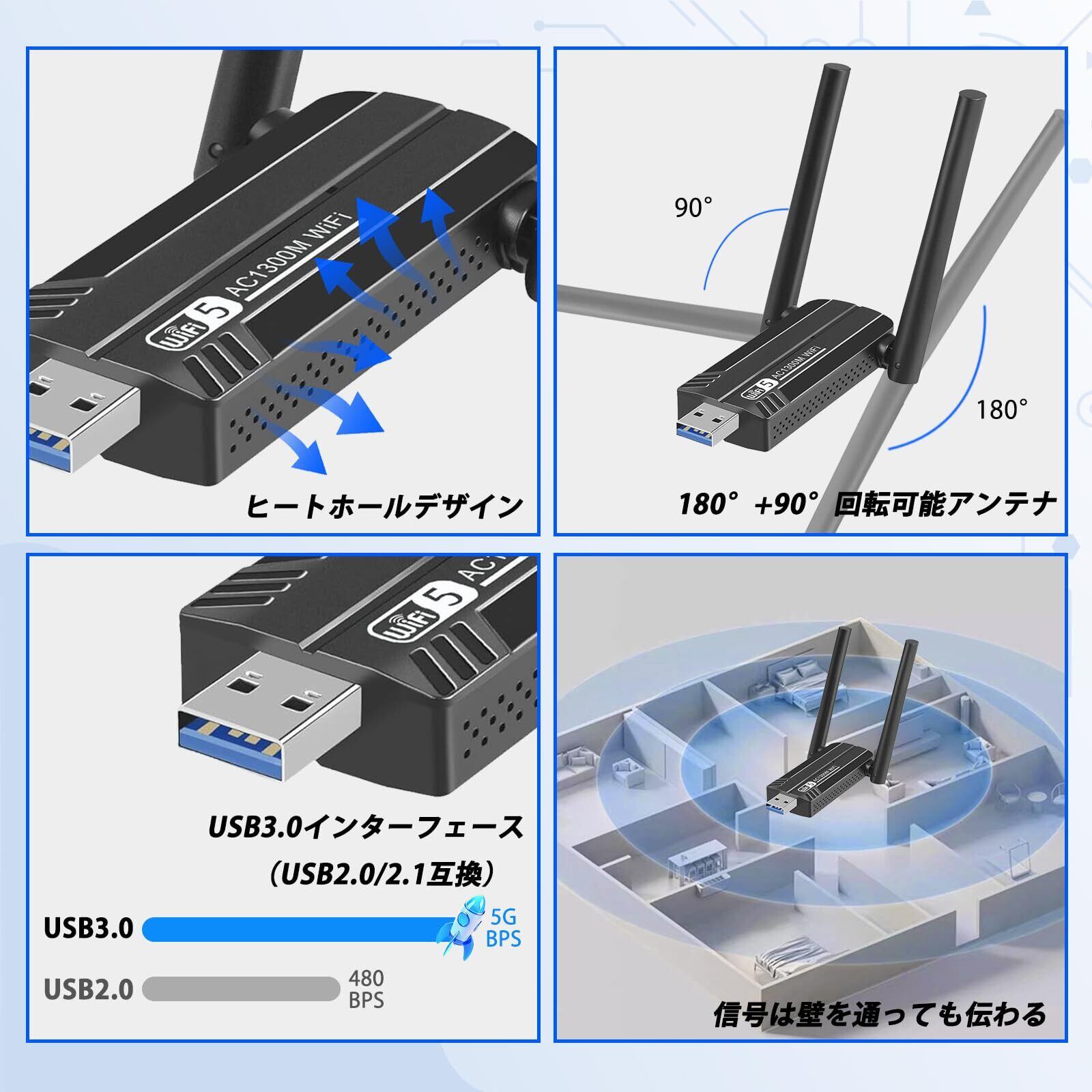 usb 無線lan 子機 wifi usb wifi 子機 1300Mbps wi-fi usbwifiアダプター 無線ラン子機 5dBi超高速通信 2.4G/5G デュアルバンド USB 3.0 Windows 7/8/8.1/10/11/XP/Vista/Linux/Mac OS 10.9-10.15に対応 日本語取扱説明書