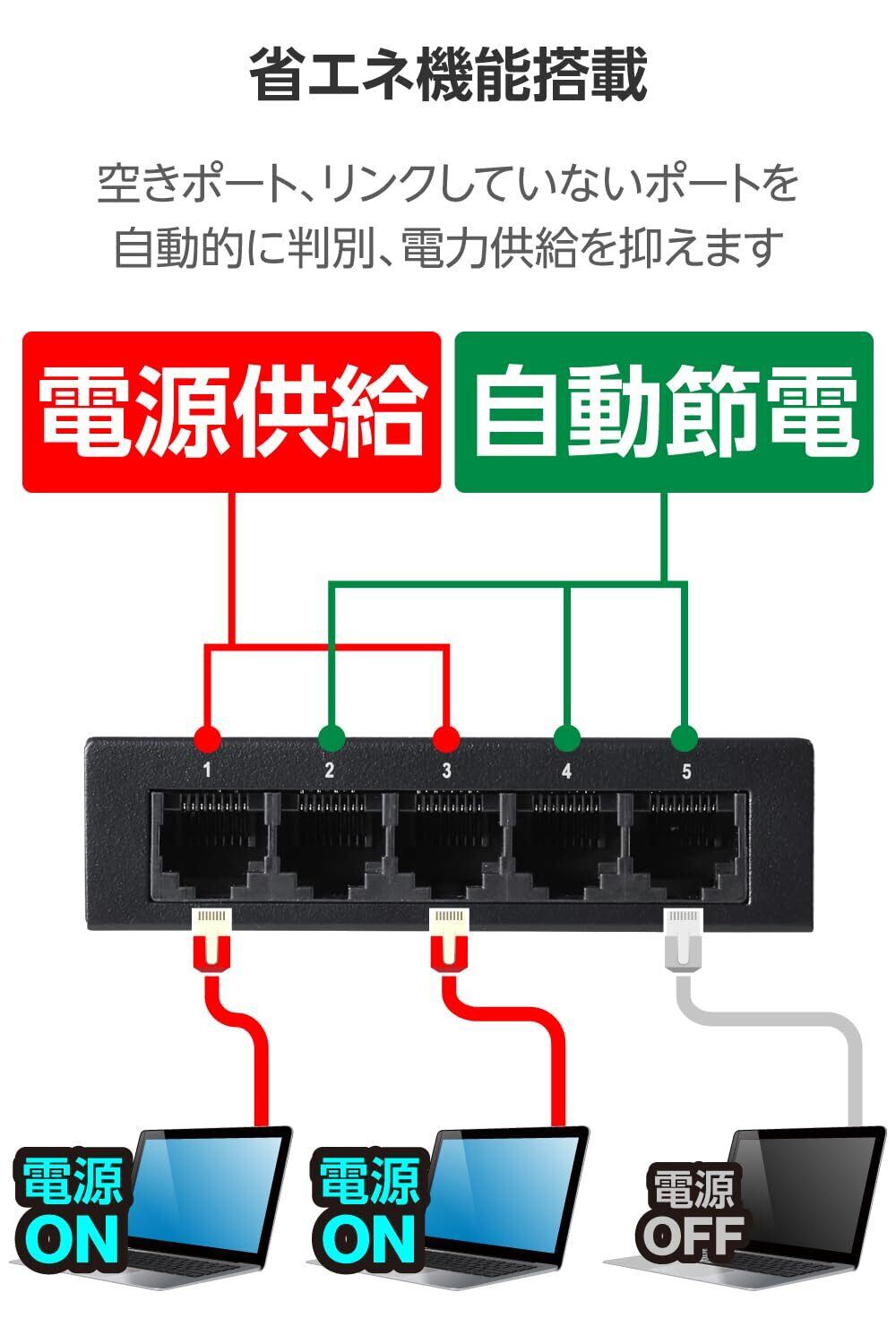 ■らくらく節電機能により接続していないポート、リンクしていないポートを自動的に判別し、電力供給を抑えます。パソコンがシャットダウンしている環境では、大幅な電力の節約を実現することができる、省エネ法に準拠したスイッチングハブです。