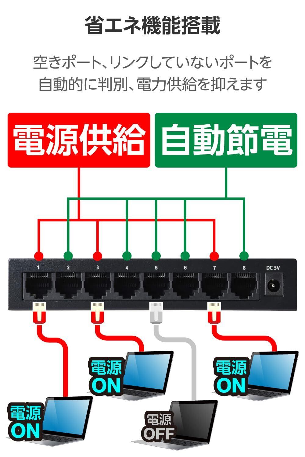 ■らくらく節電機能により接続していないポート、リンクしていないポートを自動的に判別し、電力供給を抑えます。パソコンがシャットダウンしている環境では、大幅な電力の節約を実現することができる、省エネ法に準拠したスイッチングハブです。