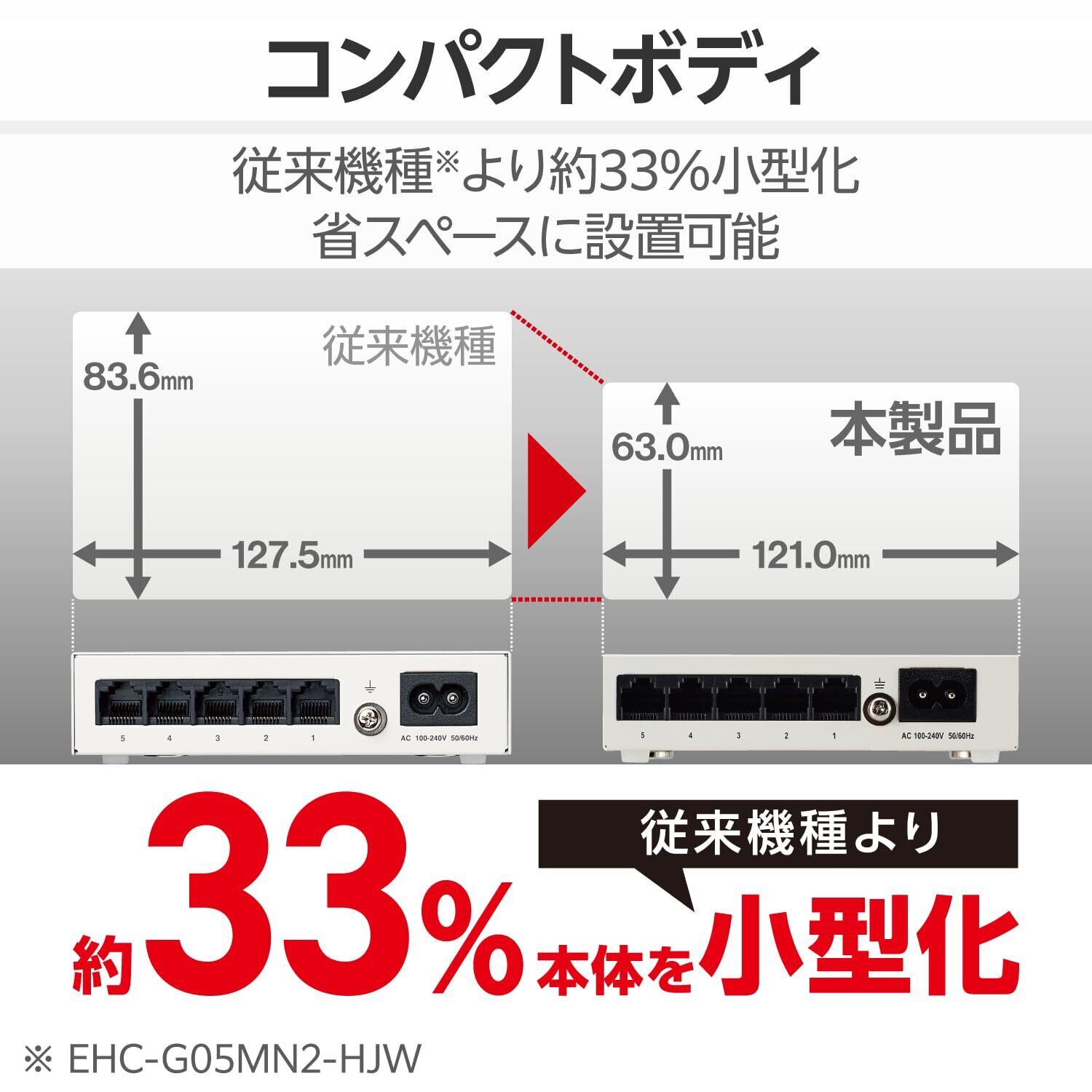 本体サイズを従来機種(※)より33%小型化し、省スペースに設置可能なコンパクトモデル。ファンレスで耐熱50℃に対応し、ループ検知機能も搭載したGiga対応、電源内蔵のメタル筐体5ポートハブです。 ※従来機種:EHC-G05MN2-HJW