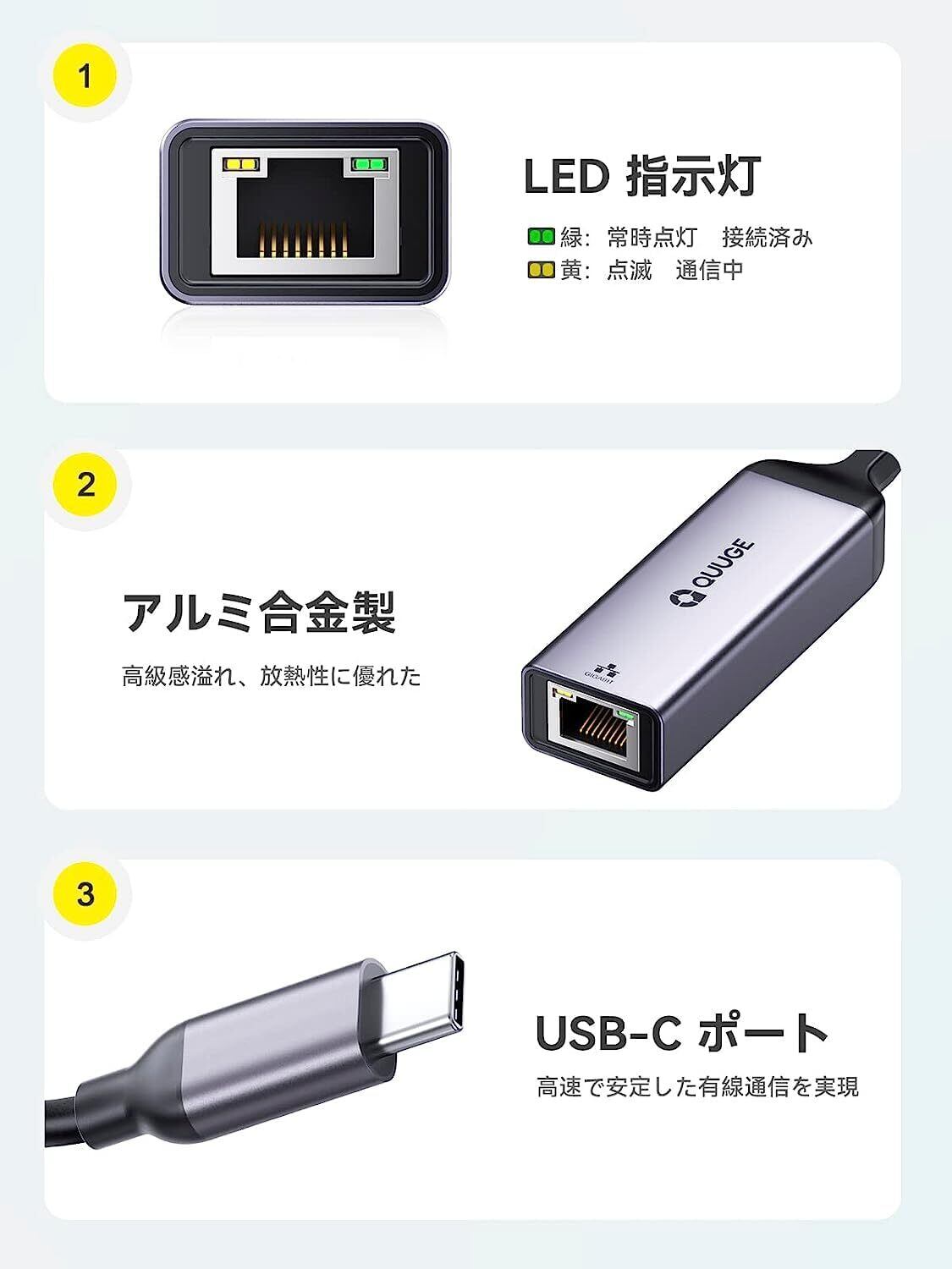 「コンパクト」コンパクトな小型LANアダプター USB3.0の重量はわずか30gで、カバンに常備でき、旅行、出張に出掛ける際に大活躍します。パッケージ内容:1×QUUGE USB3.0 to RJ45 有線LANアダプター、1×取扱説明書。(※お買い上げ日より18ヶ月付き、製品が何か問題や初期不良などがございましたら、商品ページの右側の「今すぐ買う」ボタンの下の「QUUGE」→「質問する」→「出品者に連絡」ページよりメールにて御連絡ください。)