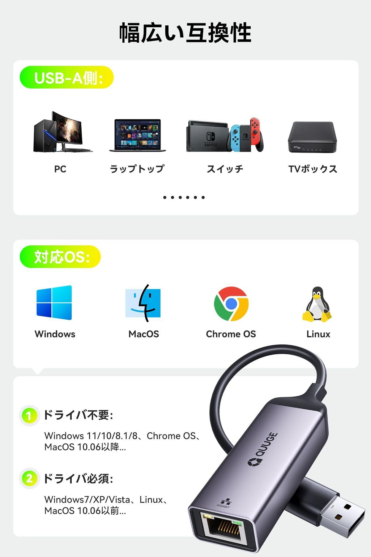 「ドライバー不要」イーサネットアダプタはドライバをインストールする必要がなく、プラグ&プレイです。操作が簡単で、USB-A端子が搭載されたデバイスに挿すだけで、1000Mbpsまでの高速イーサネット通信を使用することができます。更に、幅広い互換性あり、PC・タブレット・TVボックスだけではなく、PS4・任天堂 Switch等ゲーム機にも対応します。▲ご注意:1.Switchが有線接続できないときは電源ボタンを長押しして強制再起動してください。2.Windows7とXPはドライバが必要です。