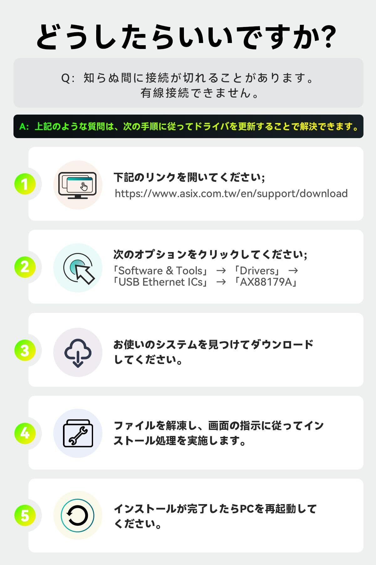 「安定した高速通信」USB LAN変換アダプターは電波干渉のない有線LAN接続を採用しており、切断のストレスもなく安定した高速通信で、オンラインプレイも快適です。Windows、OS、Linuxなどシステムに対応でき、10/100/1000Mbpsの転送速度により、WiFiのないところでも超高速有線ネットワークを楽しむことができます。▲ご注意:インターネット接続が時々途切れる場合は、カスタマーサービスに連絡してドライバーを更新する必要があります。