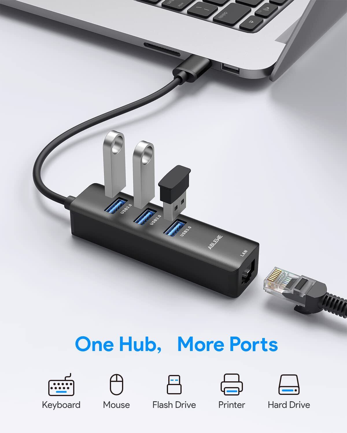 【有線LANアダプター】:ABLEWEのusb lan変換アダプター、ギガビットイーサネットポートと3つのUSB 3.0ポートが装備されています。 安定した有線ネットワークを提供すると同時に、より多くのアクセサリーを拡張することも可能です。