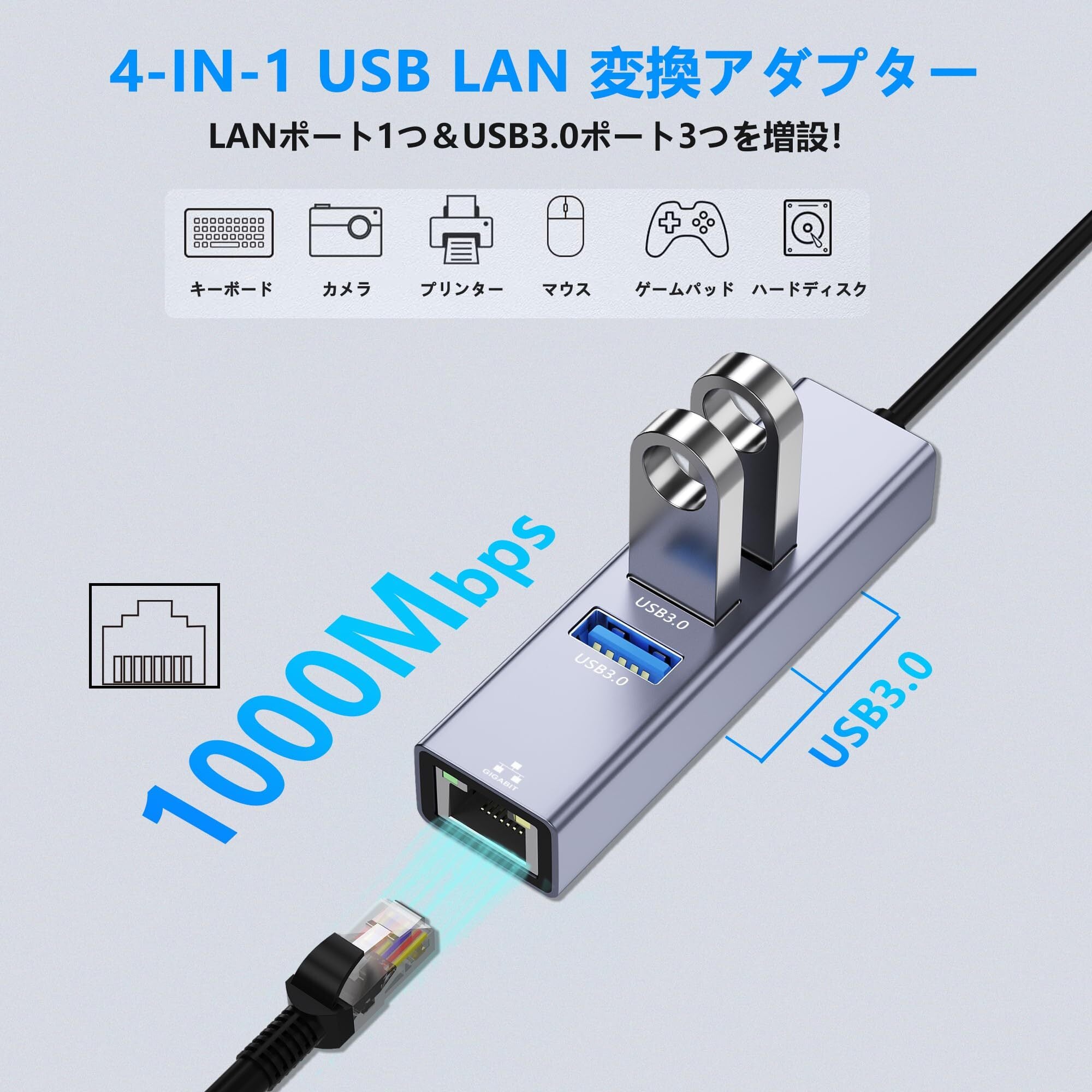 USB LAN変換アダプター 4-IN-1 USB ハブ 有線LANアダプター イーサネットアダプタ 【RJ45 1Gbps+3つUSB3.0ポート】1000Mbps高速 Type-A LANイーサネットコンバータ ギガビット LAN変換ケーブル USB-A 変換アダプタ USB Hub Windows/Mac OS/Linux等対応