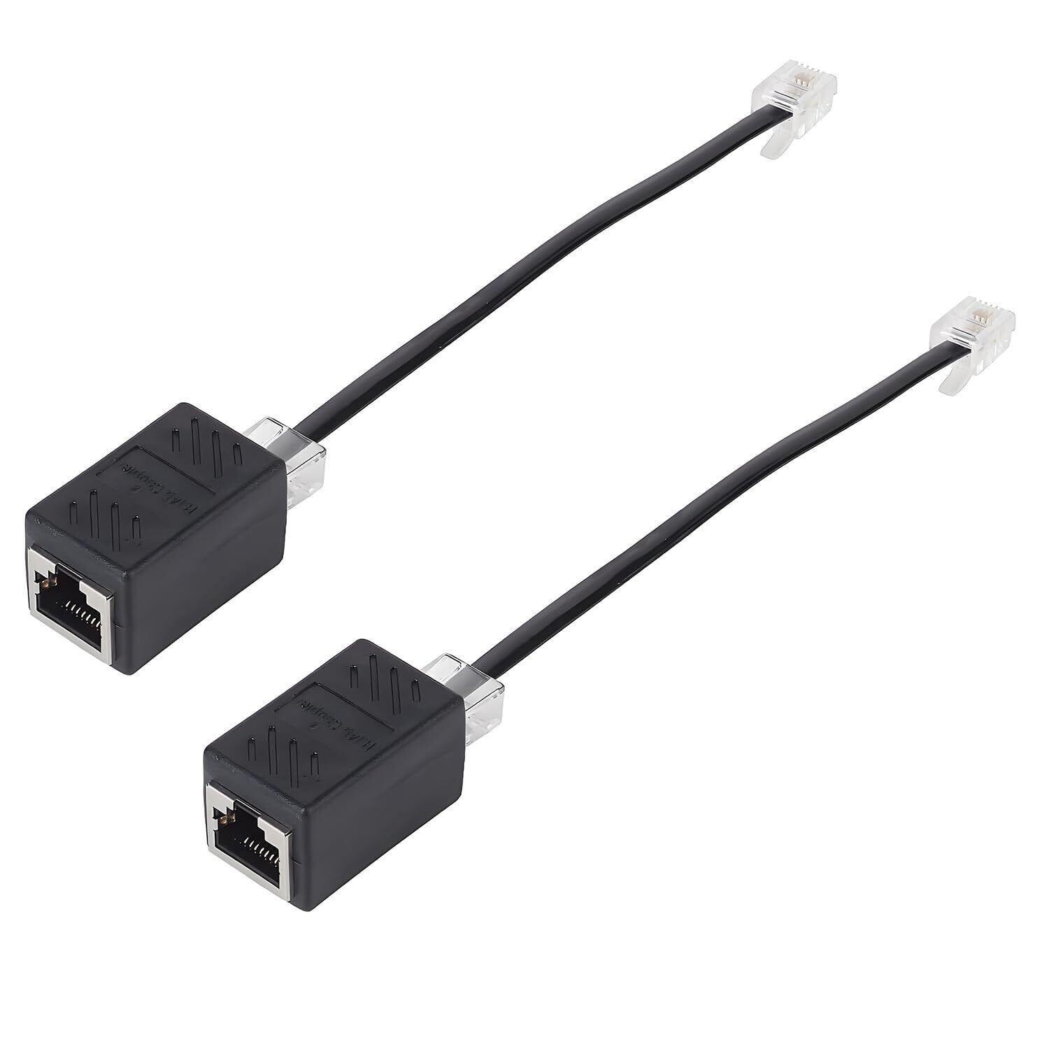 RJ45(LANケーブル)とRJ11(電話線)のコネクタを変換するアダプタです。イーサネットジャックからアナログ電話機器(電話・ファックス)へ。壁に埋め込みのLANケーブルを電話のモジュラーケーブル代わりに使って電話機の配線ができます。