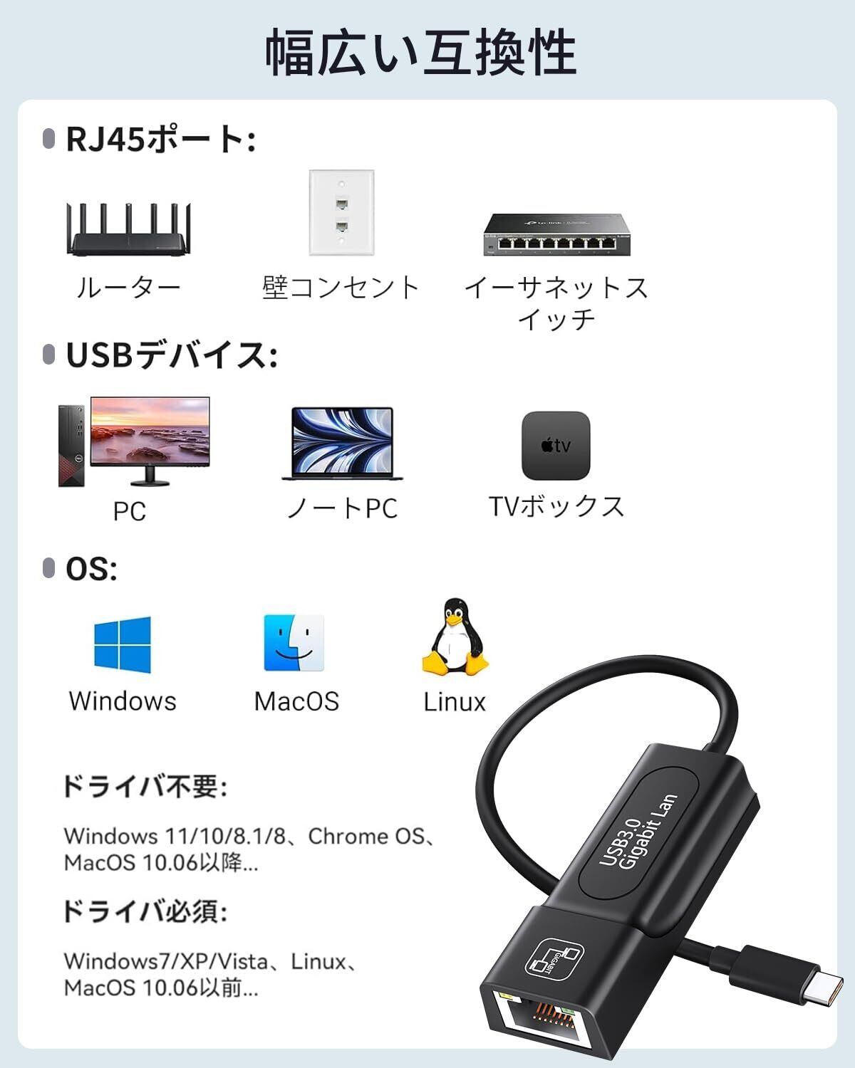 【ギガビットイーサネット】最大1Gbpsの安定した接続速度を実現します。 100Mbps/10Mbpsネットワークとの下位互換性があります。 当社の Type-C to LAN ギガビット イーサネット (RJ45) ネットワーク アダプターは、中断することなく最大速度で大量のダウンロードをサポートします。1Gbps に到達するには、必ず CAT6 以上のイーサネット ケーブルを使用してください。
