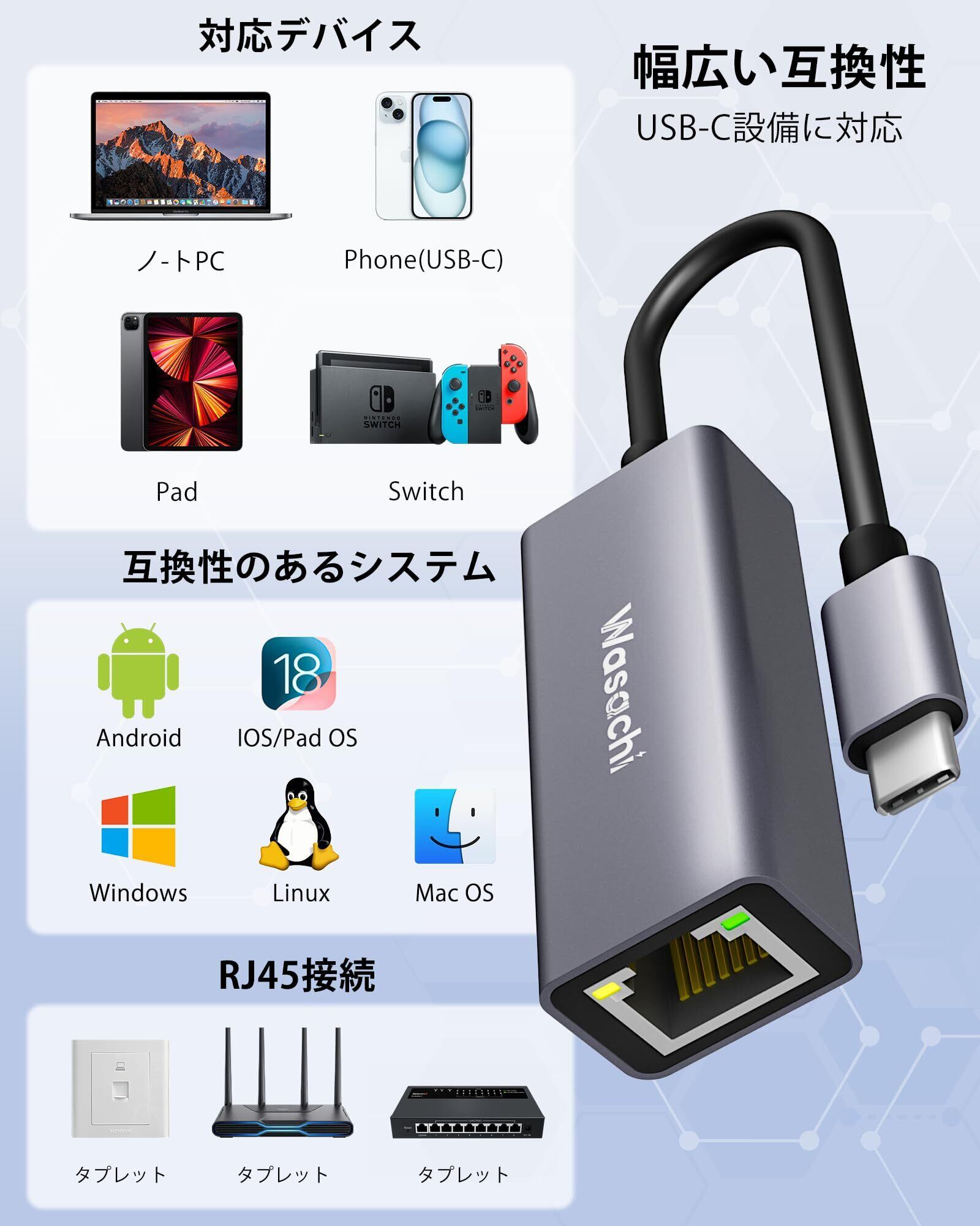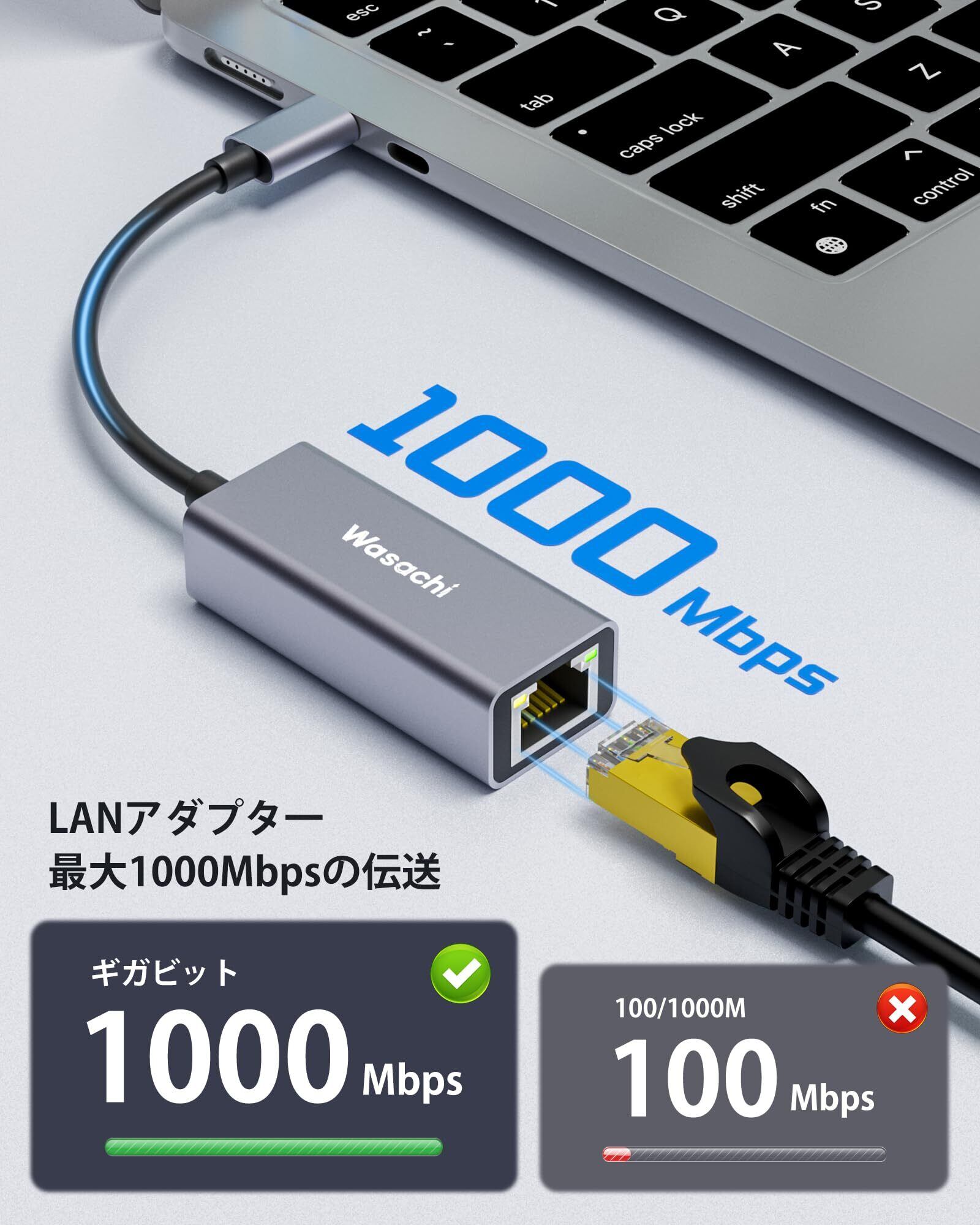Wasachi USB-C LAN 有線LANアダプター 1000Mbps超高速 Type-C to RJ45 ギガビットイーサネット lan usb 変換アダプタ MacBook iPad Pro Switchなど対応 軽量・小型設計
