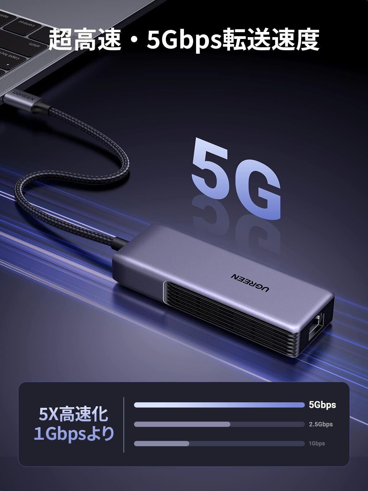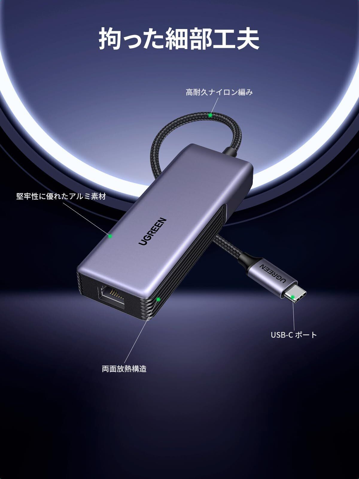 UGREEN 有線LAN アダプター 5Gbps Type C LAN 変換アダプター Thunderbolt 5/4/3には適用 アルミ素材 放熱性 USB C to RJ45 イーサネット アダプター ラップトップ Nas MacBook/XPS/Windowsには適用