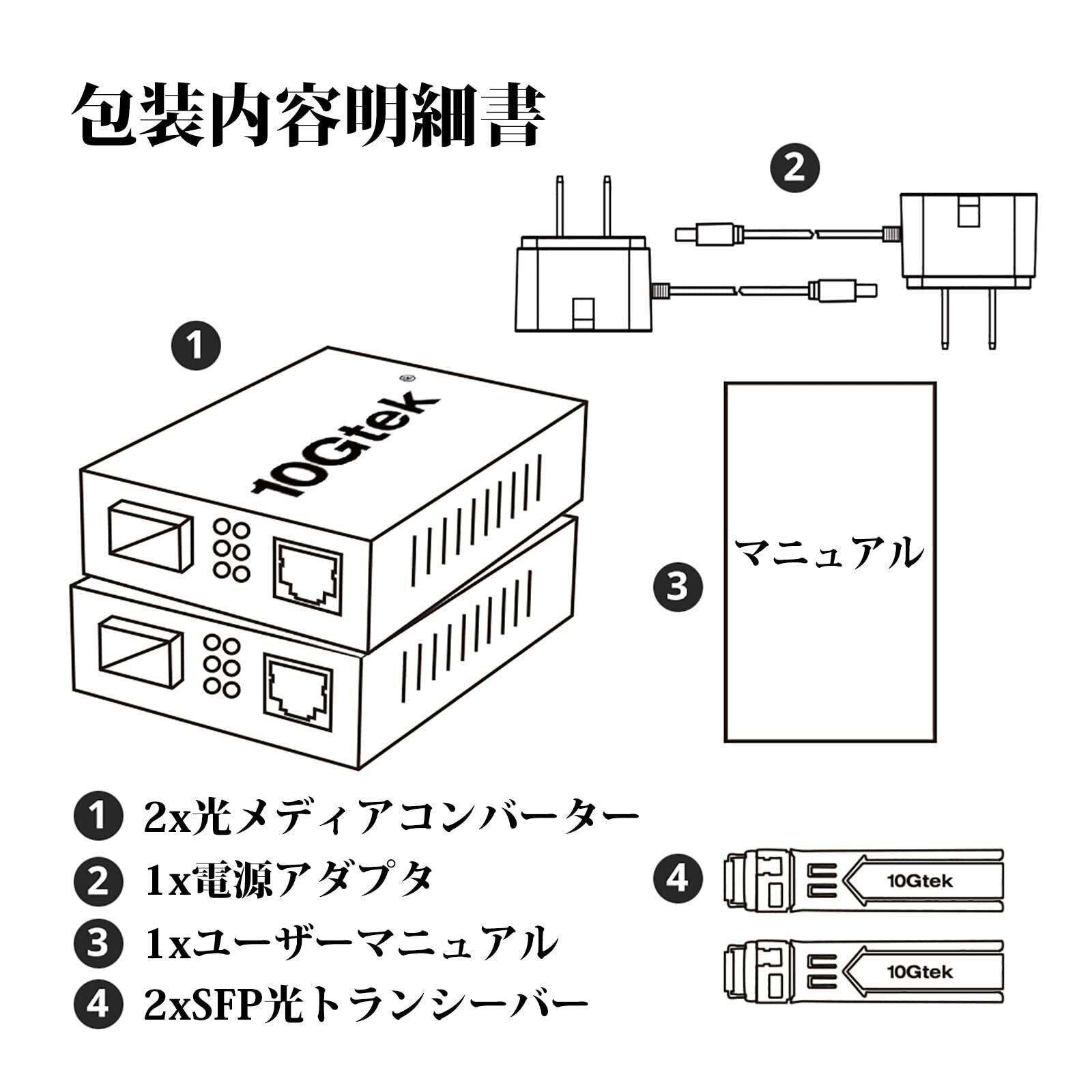 梱包内容:2*小型ギガビットメディアコンバータ、1対BiDi 1000Base-LX SFPモジュール、2*DC電源アダプタ(5V-1A、PSE認定)、1*マニュアル。