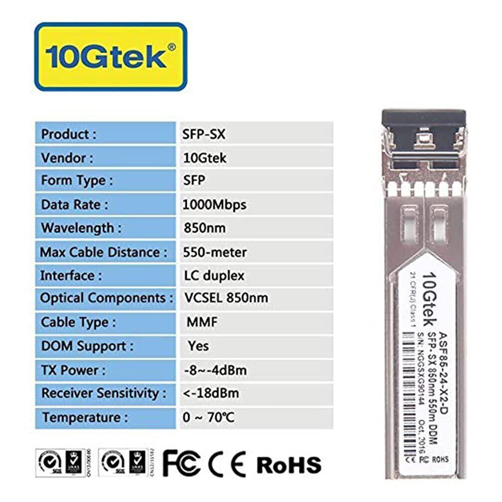 10Gtek 1.25G SFP 1000Base-SX, 850nm MMF, 最大550m, 光トランシーバ, Cisco GLC-SX-MMD/GLC-SX-MM/SFP-GE-S、Netgear、Ubiquiti UF-MM-1G、Mikrotik S-85DLC05D、D-Link、Supermicroなど互換