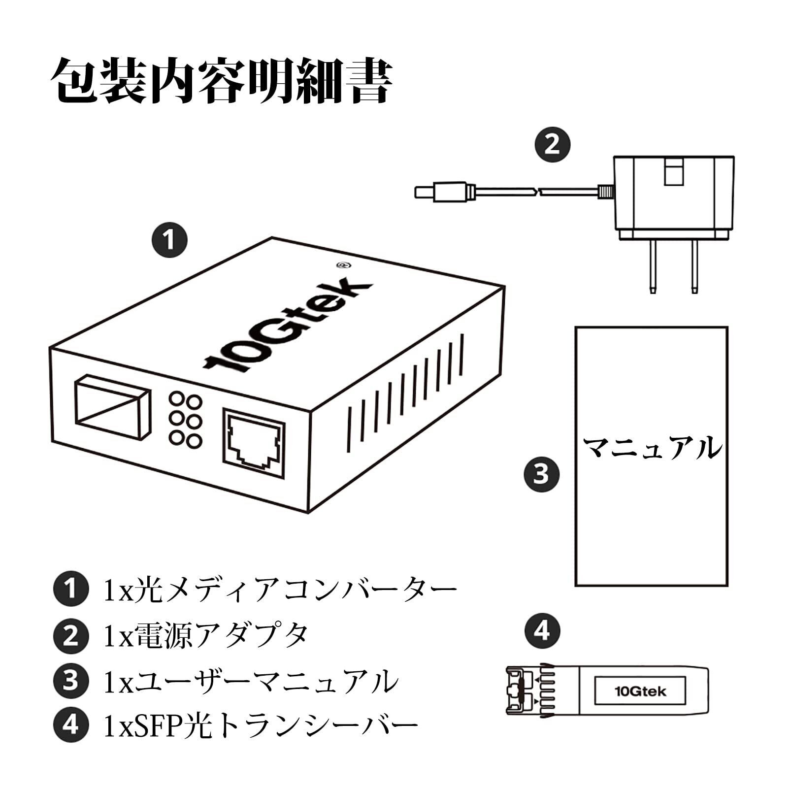 梱包内容:1*小型ギガビットメディアコンバータ、1*1000Base-SX SFP、1*DC電源アダプタ(5V-1A、PSE認定)、1*マニュアル。