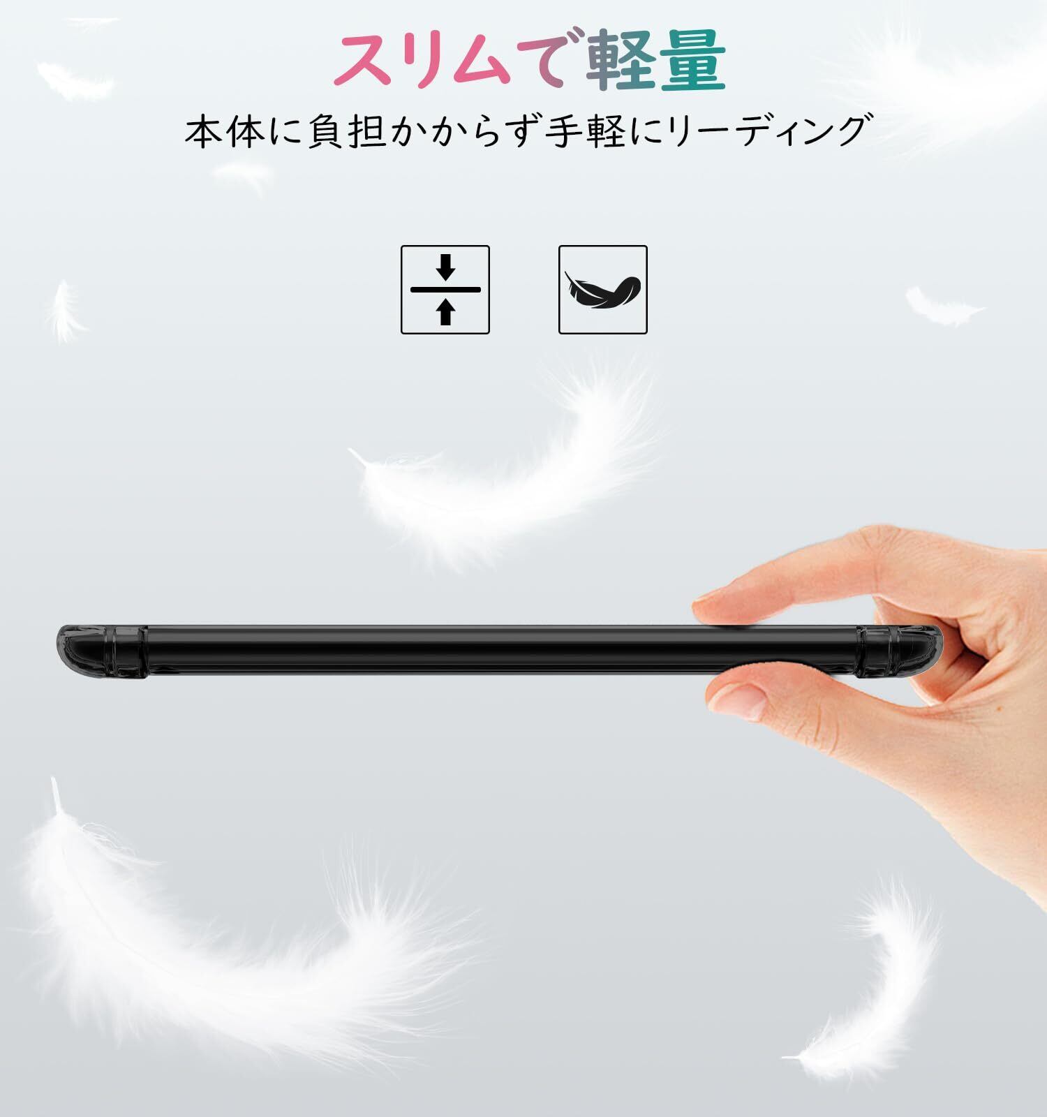シンプルな透明ブラックのデザインは、Kindleの魅力を引き立てつつ、使用中に目立たないのが特徴です。スタイリッシュでシンプルな外観は、シーンを選ばずにマッチします。