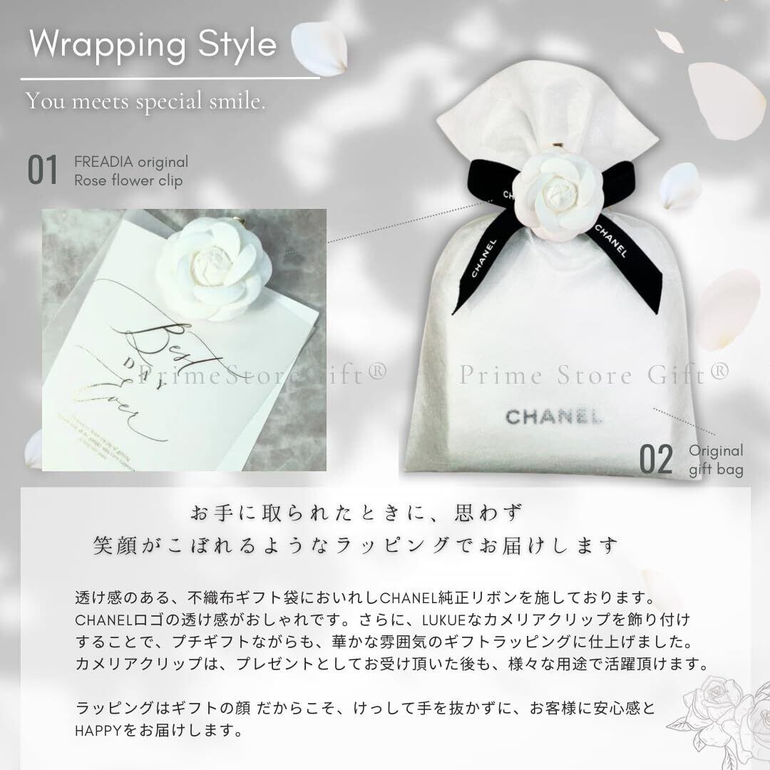 ️【ドラマチックなラッピング】透け感のある、不織布ギフト袋においれしCHANEL純正リボンを施しております。 CHANELロゴの透け感がおしゃれです。さらに、Originalローズフラワークリップを飾り付け することで、プチギフトながらも、華かな雰囲気のギフトラッピングに仕上げました。プレゼントとしてお受け頂いた後も、様々な用途で活躍頂けます。 ※ローズの色は3種類の中からお届けとなり事前にカラーをお選び頂けません。