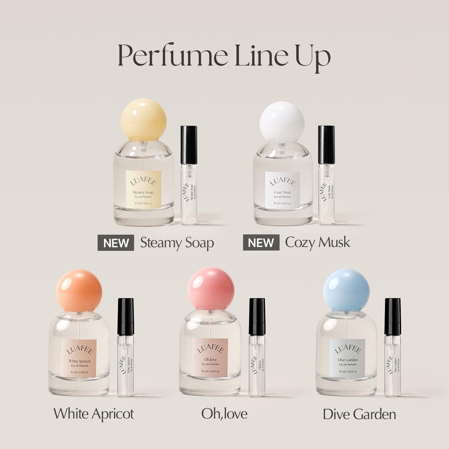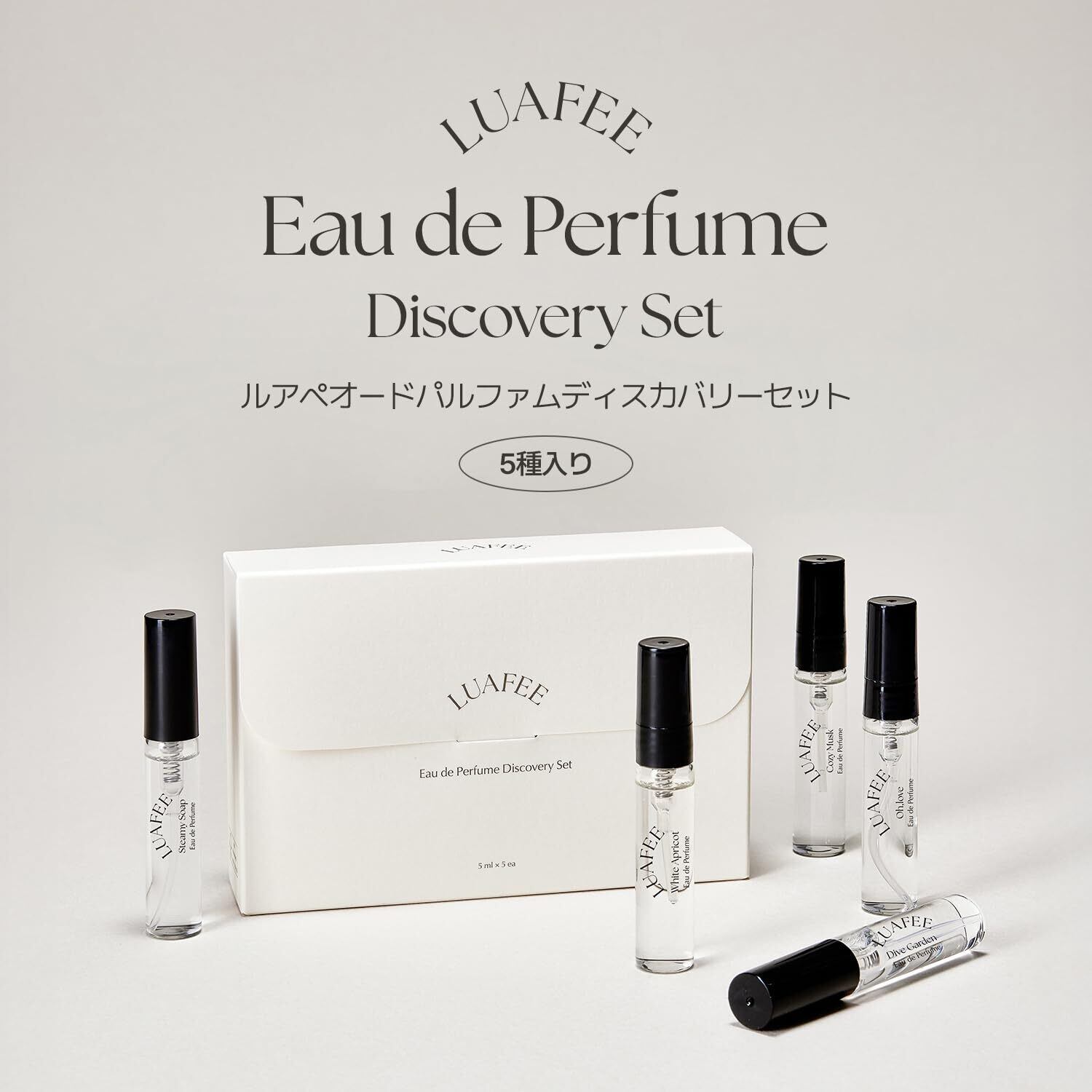 LUAFEEのオードパルファムミニチュアセットは、あなたの気分やシーンによって使い分けできる5種類の魅力的な香りが揃っています。ホワイトアプリコットの甘さ、オーラブのフローラルな香り、ダイブガーデンの爽やかさ、コージームスクの温もり、スティーミーソープの清潔感が、日常を特別に演出します!
