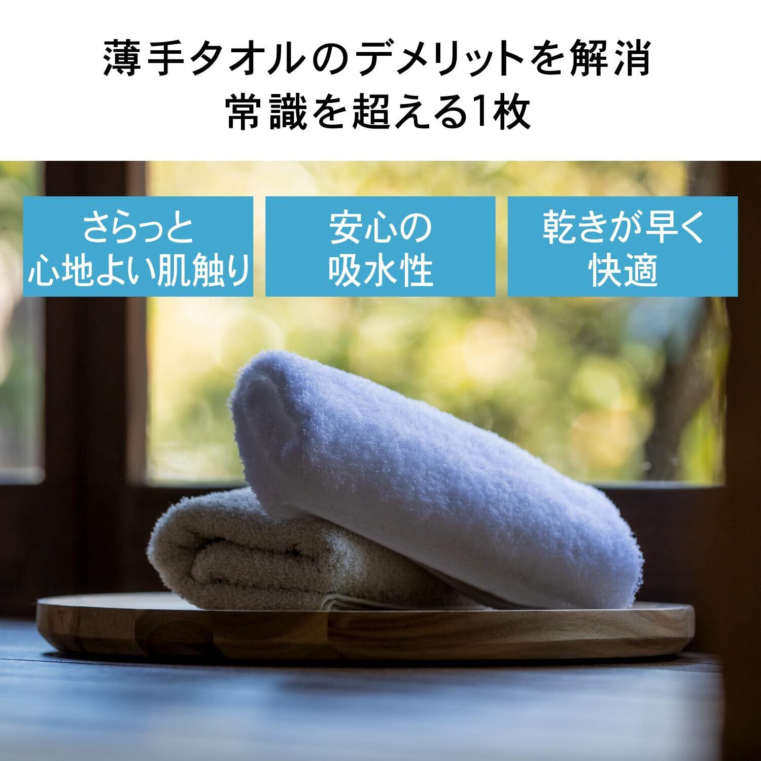【エアリー感のあるタオル 】手に取った際に、見た目よりも軽く、驚く程のエアリー感があります。薄手でかさばらないため収納性の高さはもちろんのこと、パイル立ちの良い繊細な風合いを楽しめます。 また、綿100%の商品なので、安心してお使いいただけます。